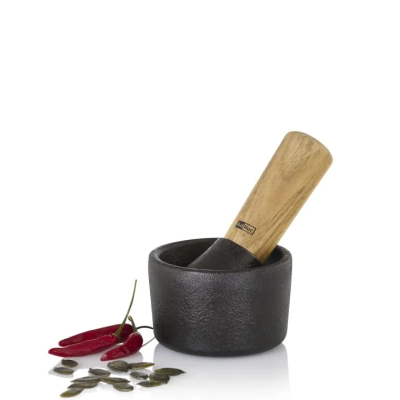 Der gusseiserne Mörser Camo.8 von AdHoc ist ideal zum Zerkleinern, Zerreiben und Zerstampfen von Kräutern und Gewürzen geeignet. Die Reibfläche aus Eisen garantiert zuverlässiges Zermahlen, der Stößel aus Akazienholz liegt angenehm in der Hand. Der Mörser ist nicht für die Reinigung in der Spülmaschine geeignet und sollte nach Gebrauch sorgfältig abgetrocknet werden, um Rostflecken zu vermeiden. Der Mörser hat einen Durchmesser von 8 cm und ist 5 cm hoch; der Stößel ist 12,8 cm lang.