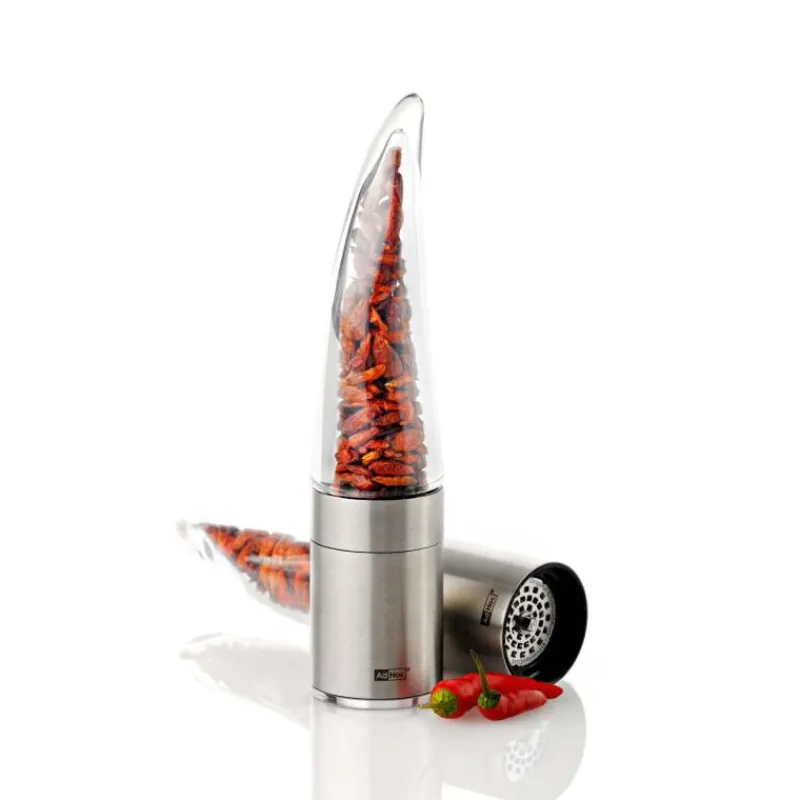 An der individuellen Gestaltung des Pepe Chilischneiders von AdHoc lässt sich sofort seine Funktion erkennen: er zerkleinert zuverlässig getrocknete Chilischoten samt Kernen. Der Chilischneider ist mit einem patentgeschütztem Mahlwerk von AdHoc ausgestattet, das dafür sorgt, dass beim Zerkleinern der Chili ätherische öle freigesetzt werden, die für die optimale Entfaltung der Chiliaromen notwendig sind. Auch lässt sich das Chilipulver sehr fein dosieren. Die Aromaschutzkappe sorgt für eine saubere Arbeitsfläche und schützt gleichzeitig die enthaltenen Gewürze. Der Pepe Chilischneider ist neben Chilischoten auch für Ingwer, rosa Pfeffer, Fenchel, Kümmel und Senfsaat geeignet. Er ist 20,5 cm hoch und durch sein elegantes Design ein echter Hingucker auf dem Esstisch.