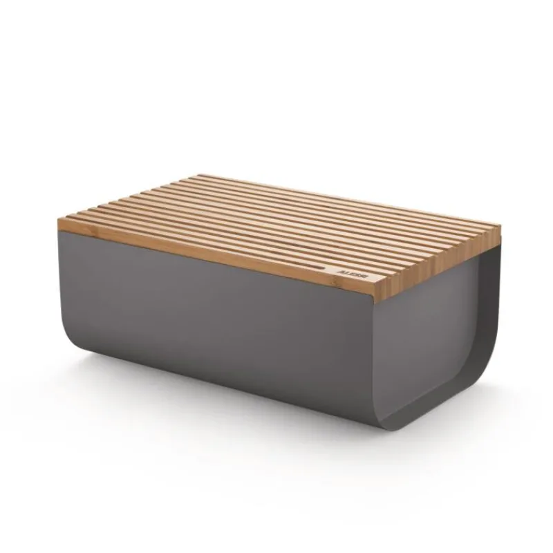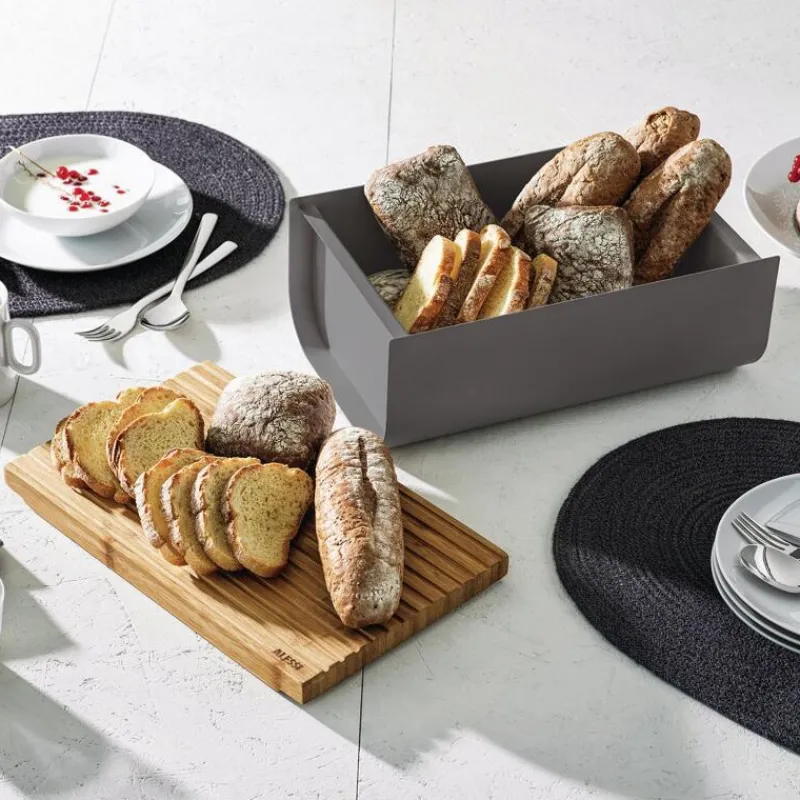 Mattina ist mehr als nur ein Brotkasten: das Design-Studio Big-Game hat für Alessi ein Mehrzweckobjekt geschaffen, das das alltägliche Ritual des Frühstücks und Abendbrots mit seiner Funktionalität und durchdachtem Design aufwertet. Der Brotkasten ist hier nicht nur Behälter mit Deckel, gleichzeitig ist es ein praktisches Schneidebrett, mit dem auch Brot serviert werden kann. Der Kasten besteht aus epoxidharzbeschichtetem Stahl, der Deckel ist aus Bambusholz gefertigt. Seine Größe von 34 x 21 cm ist für Brot und Brötchen aller Art geeignet.