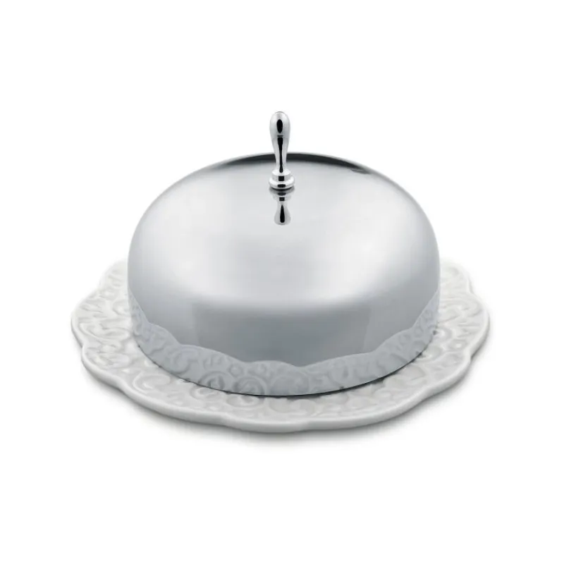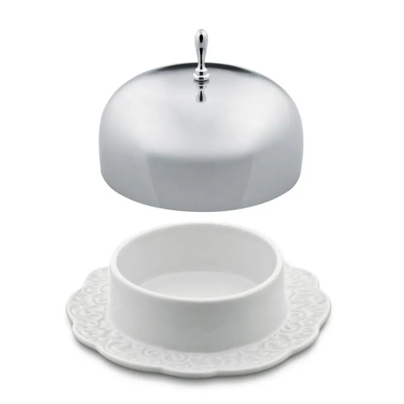 Die Butterdose aus weißem Porzellan und Edelstahl ist die perfekte Ergänzung zum Service Dressed von Alessi. Mit ihrer originellen Formensprache und stilisierten Verzierung kommen Frühstücksliebhaber und Butterbrot-Enthusiasten voll auf ihre Kosten. Der Deckel ist mit einem kleinen Griff ausgestattet, so lässt er sich leicht anheben und der leckere Inhalt wird offenbart. Die Butterdose ist 7,6 cm hoch, hat einen Durchmesser von 12 cm und kann in der Spülmaschine gereinigt werden.