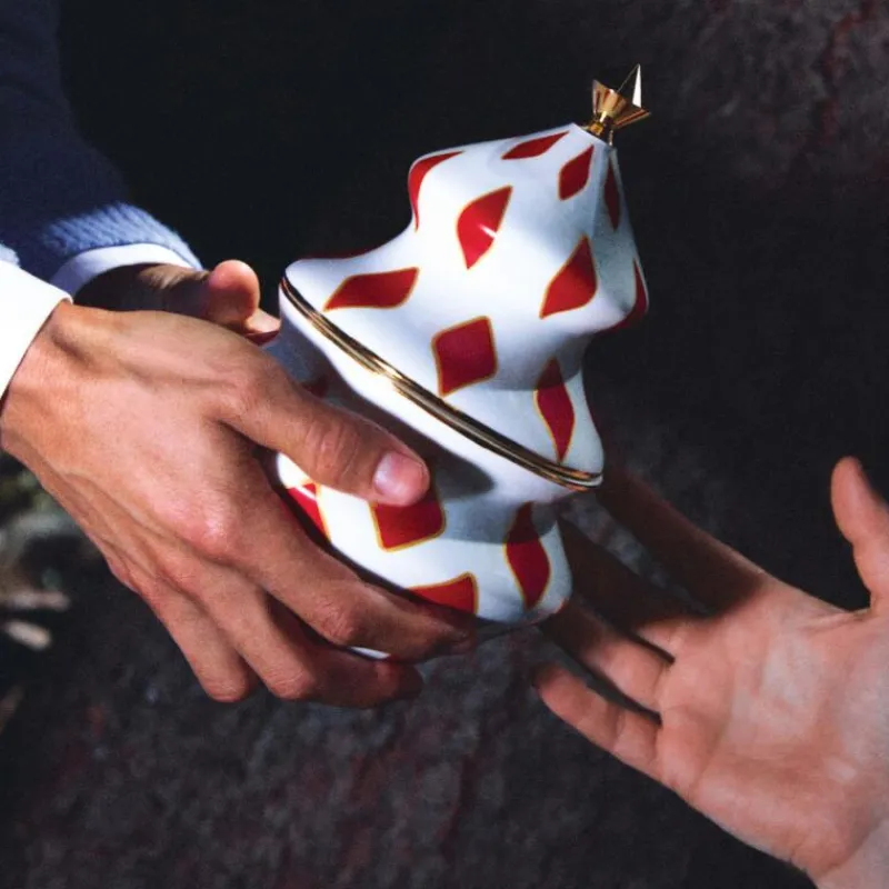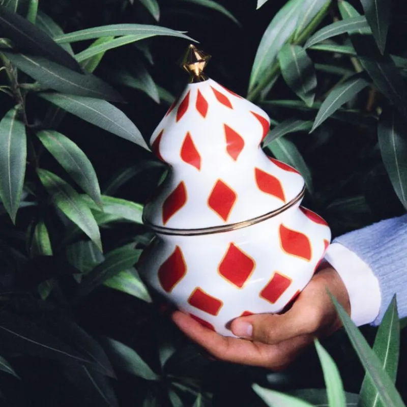 Die unverwechselbare Pop-Sprache der Designerin Nika Zupanc zeichnet auch die von ihr entworfene Weihnachtskollektion Delight aus. Inspiriert von traditionellen Symbolen und der klassischen Ikonographie der Weihnachtszeit entstanden verträumte Objekte in den Farben Rot, Weiß und Gold. Delight ist eine gelungene Kombination aus origineller Formensprache sowie einem Dialog aus Tradition und Moderne, welche die magische Atmosphäre von Weihnachten nach Hause bringt. Der handdekorierte Behälter besteht aus Porzellan, er ist ideal geeignet, um Süßgkeiten oder andere Kleinigkeiten aufzubewahren. Er ist 22 cm hoch, hat einen Durchmesser von 15,5 cm und ein Fassungsvermögen von 600 ml.