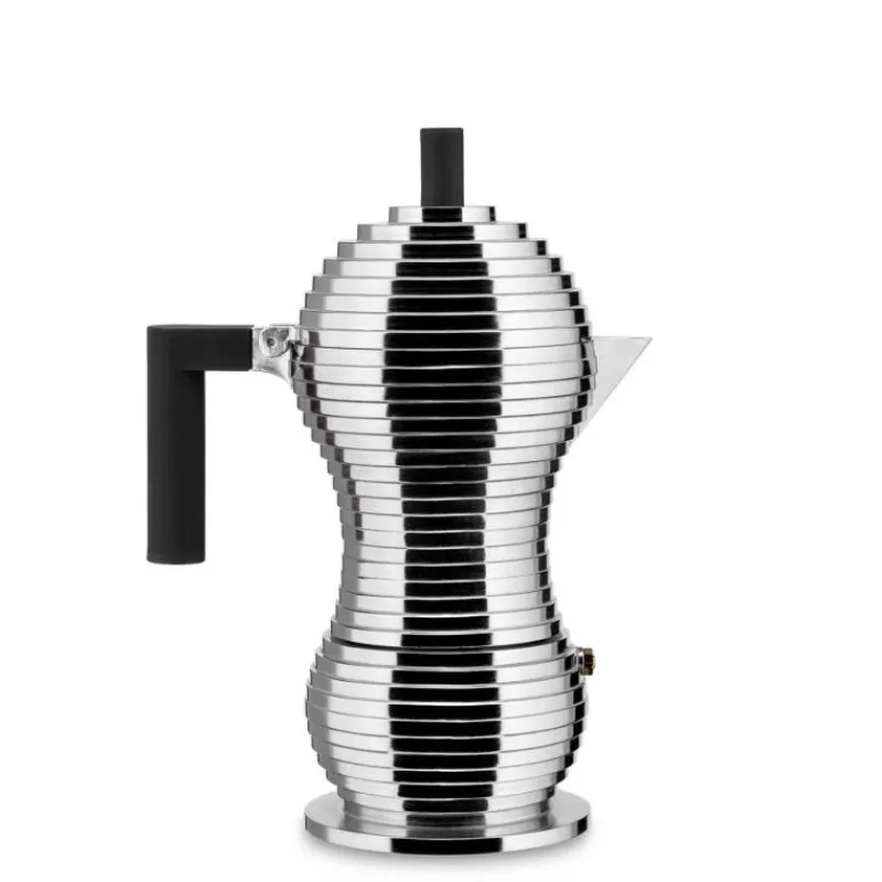 Der revolutionäre Espressobereiter Pulcina enstand auf der Jagd von Michele De Lucchi nach dem perfekten Espresso. Er integriert die bewährte Technologie von illycaffè mit der langjährigen Erfahrung von Alessi, indem er aus Aluminium eine Idealform des Kessel formt, die den Kaffeefluss genau im richtigen Moment unterbricht. Durch den Magnetboden aus Stahl ist die Kanne auch für Induktionsherde geeignet (falls das Kochfeld in der Lage ist, mit einem Minimum von Ø90 mm aktiviert zu werden). So wird die vukanische Phase vermieden, welche dem Espresso ansonsten ein leicht bitteres, verbranntes Aroma zusetzt. Durch den schnabelförmigen Ausguss gelangt so nur der aromatische, kräftige Espresso in die Tasse. Griff und Deckel der Kanne sind aus rotem oder schwarzen Polyamid gefertigt und verhindern so ein Verbrennen der Hand. Wird der Espressokocher voll befüllt, reicht das Fassungsvermögen für circa sechs Tassen Espresso.