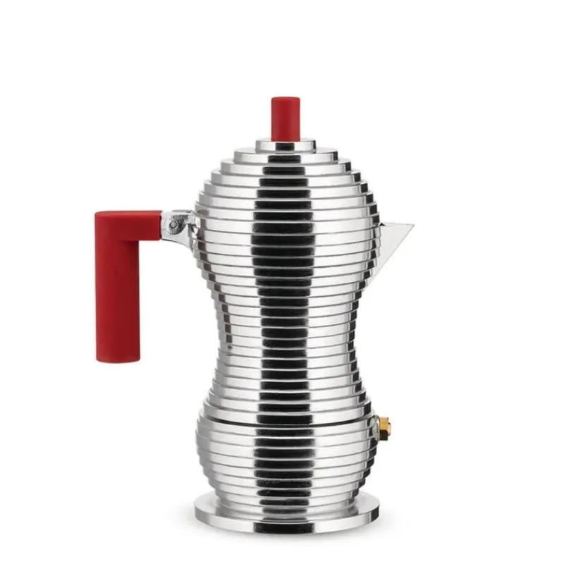 Der revolutionäre Espressobereiter Pulcina enstand auf der Jagd von Michele De Lucchi nach dem perfekten Espresso. Er integriert die bewährte Technologie von illycaffè mit der langjährigen Erfahrung von Alessi, indem er aus Aluminium eine Idealform des Kessel formt, die den Kaffeefluss genau im richtigen Moment unterbricht. So wird die vukanische Phase vermieden, welche dem Espresso ansonsten ein leicht bitteres, verbranntes Aroma zusetzt. Durch den schnabelförmigen Ausguss gelangt so nur der aromatische, kräftige Espresso in die Tasse. Griff und Deckel der Kanne sind aus rotem oder schwarzen Polyamid gefertigt und verhindern so ein Verbrennen der Hand. Wird der Espressokocher voll befüllt, reicht das Fassungsvermögen für circa drei Tassen Espresso.