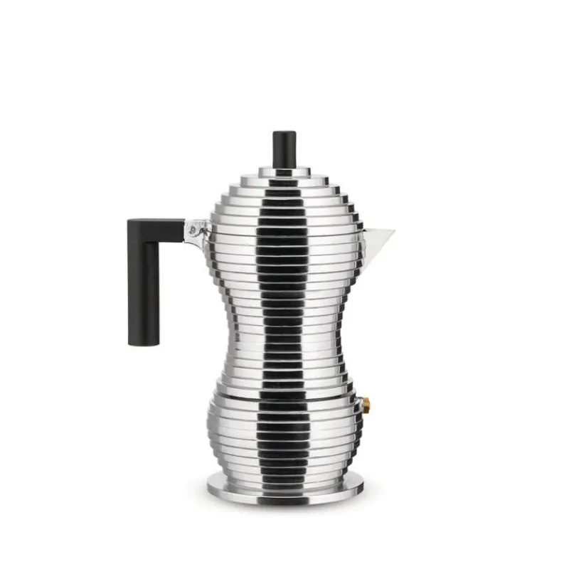 Der revolutionäre Espressobereiter Pulcina enstand auf der Jagd von Michele De Lucchi nach dem perfekten Espresso. Er integriert die bewährte Technologie von illycaffè mit der langjährigen Erfahrung von Alessi, indem er aus Aluminium eine Idealform des Kessel formt, die den Kaffeefluss genau im richtigen Moment unterbricht. So wird die vukanische Phase vermieden, welche dem Espresso ansonsten ein leicht bitteres, verbranntes Aroma zusetzt. Durch den schnabelförmigen Ausguss gelangt so nur der aromatische, kräftige Espresso in die Tasse. Griff und Deckel der Kanne sind aus rotem oder schwarzen Polyamid gefertigt und verhindern so ein Verbrennen der Hand. Wird der Espressokocher voll befüllt, reicht das Fassungsvermögen für eine Tasse Espresso.