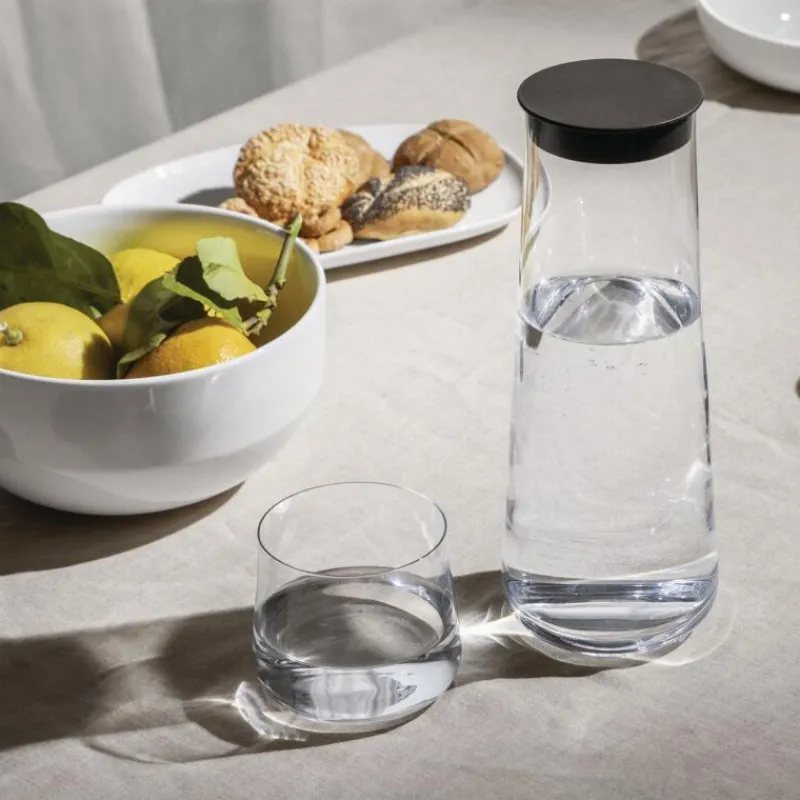 Die Glas-Kollektion Eugenia von Alessi wurde vom japanischen Designer Naoto Fukasawa entworfen, der sich von der Leidenschaft des Firmengründers Alberto Alessis für Wein inspirieren ließ. Alssi gründete dazu eigens das Unternehmen „La signora Eugenia e il passero solitario“ (Dt. Frau Eugenia und der einsame Spatz), welches Produkte in Flaschen nach einem Entwurf Leonardo da Vincis vertreibt. Ausgehend von dieser besonderen Flaschenform entwickelte Fukasawa die minimalistische Glas-Serie Eugenia, deren besonderes Merkmal der stumpfe Winkel (jap. „donkaku“) ist. Dieser Winkel wird bei Berühren des Glases mit den Lippen spürbar, ein einzigartiges Detail, was für die konische Form des Glas unterstützt wird. Die vielseitige Kollektion Eugenia wird allen Anforderungen an Nutzen und Verkostung gerecht, so wird der Weingenuß zu einem Moment der Meditation und Selbstfürsorge. Das Wasserglas besteht wie der Rest der Serie aus Kristallglas, es ist mit einem Volumen von 390 ml für Getränke aller Art geeignet. Im Set enthalten sind vier spülmaschinengeeignete Gläser.