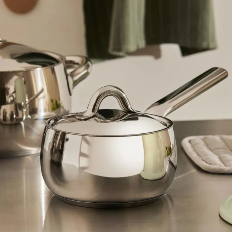 Stefano Giovanonni hat mit der Topfserie Mami für Alessi antike Terrakotta-Töpfe auf eine eindrucksvolle Weise neu interpretiert, indem er sich von der Poetik von Emotionen inspirieren ließ. Funktioneller und praktischer Edelstahl trifft bei dieser Kollektion auf große, bauchige Töpfe, die eine warme Gemütlichkeit ausstrahlen. Alle Teile der Serie Mami sind mit einem Magnetboden aus Stahl ausgestattet und somit für den Einsatz auf Induktionsherden geeignet. Die Stielkasserolle ist einem langen Griff ausgestattet und perfekt zum Braten und Schmoren geeignet. Sie besteht aus glänzend poliertem Edelstahl und hat ein Volumen von einem Liter.