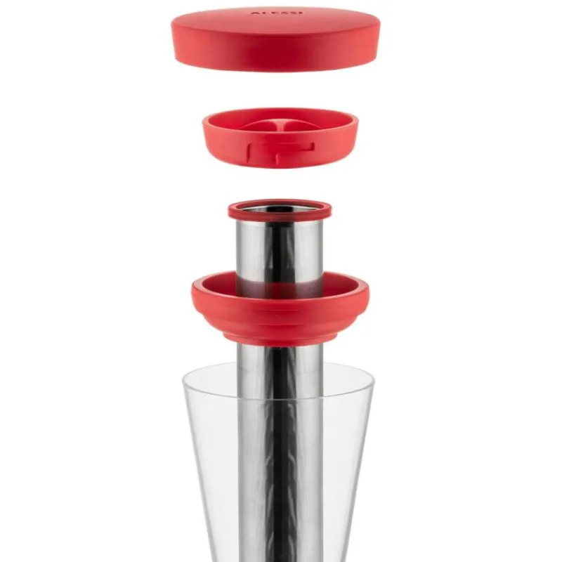 Der Kaffeezubereiter Mazagran von Alessi stammt aus der Feder des italienischen Produktdesigners Giulio Iacchetti. Dieser hat sich intensiv mit den verschiedenen Methoden der Kaffeezubereitung auseinandergesetzt und eine Kanne entworfen, mit der der Kaffee kalt gebrüht werden kann. Im algerischen Dorf Mazagran soll diese Art der Zubereitung ihren Ursprung haben: durch Verzicht auf heißes Wasser wird die Oxidation des Kaffees vermieden und es entsteht ein Getränk mit einem intensiven, vollmundigem Geschmack. Das Design der Kanne ist perfekt für die Zubereitung von kalt gebrühtem Kaffee, ihre Trichterform erleichtert das Einfüllen von Wasser, welches dann durch den Filter im Inneren der Kanne strömt. Die schlanke Form passt in die Kühlschranktür, so kann der Kaffee auf der richtigen Temperatur gehalten werden. Der Mazagran Kaffeezubereiter besteht aus hitzebeständigem Glas mit einem Deckel aus Kunststoff. Der Filter aus Edelstahl garantiert köstlichen, erfrischenden Kaffee mit intensiven Geschmacksaromen. Die Kanne ist 32 cm hoch und hat einen Durchmesser von 10,5 cm. Sie fasst bis zu 900 ml Kaffee und sollte nur von Hand gespült werden.