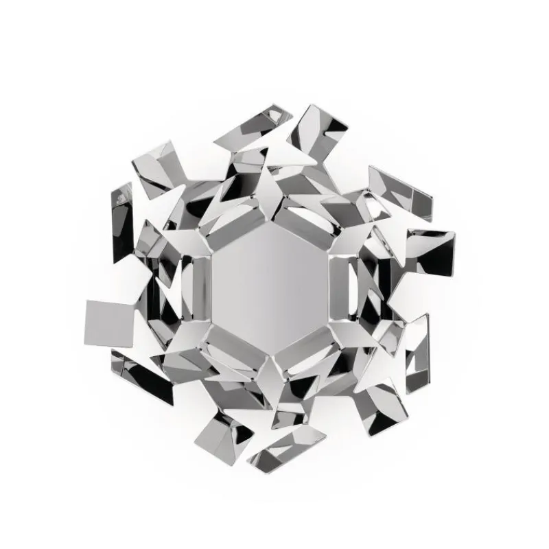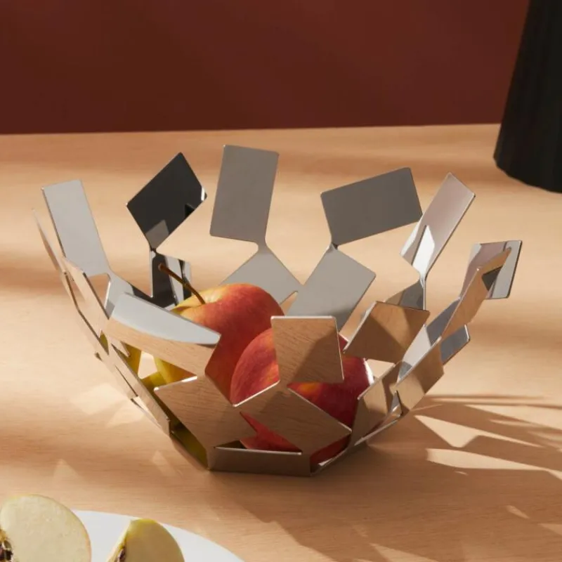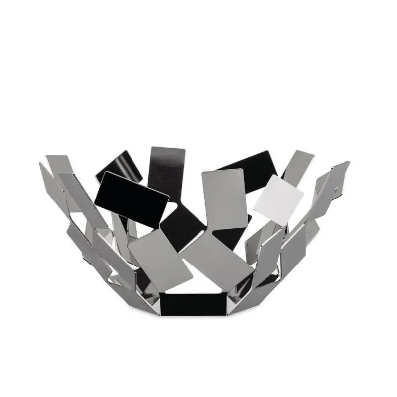 Die einzigartige Form der Obstschale La Stanza dello Scirocco soll an vom Wind durcheinandergewirbelte Papierstücke erinnern. Inspiriert wurde der Designer Mario Trimarchi von der stillen und nachdenklichen Atmosphäre der großen Landhäuser Siziliens, in die er sich vor dem gefürchteten Scirocco-Wind geflüchtet hatte. Die scheinbar fragile Konstruktion aus silbern glänzenden Edelstahlplatten hat einen Durchmesser von 27,5 cm und ist 13 cm hoch. In ihr finden nicht nur Obst, sondern auch Gemüse und kleine Wohnaccessoires einen dekorativen Platz.