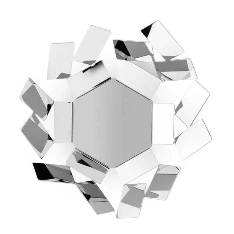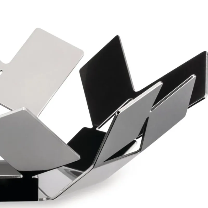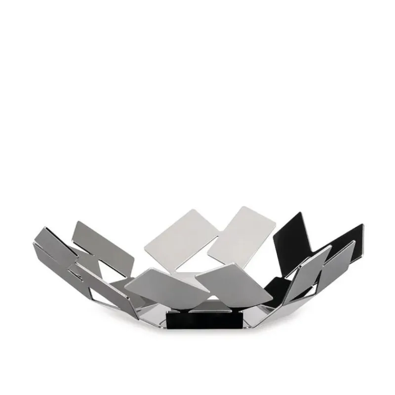 Die einzigartige Form der Obstschale La Stanza dello Scirocco soll an vom Wind durcheinandergewirbelte Papierstücke erinnern. Inspiriert wurde der Designer Mario Trimarchi von der stillen und nachdenklichen Atmosphäre der großen Landhäuser Siziliens, in die er sich vor dem gefürchteten Scirocco-Wind geflüchtet hatte. Die scheinbar fragile Konstruktion aus glänzend polierten Edelstahlplatten hat einen Durchmesser von 24,5 cm und ist 6,2 cm hoch. In ihr finden nicht nur Obst, sondern auch Gemüse und kleine Wohnaccessoires einen dekorativen Platz.
