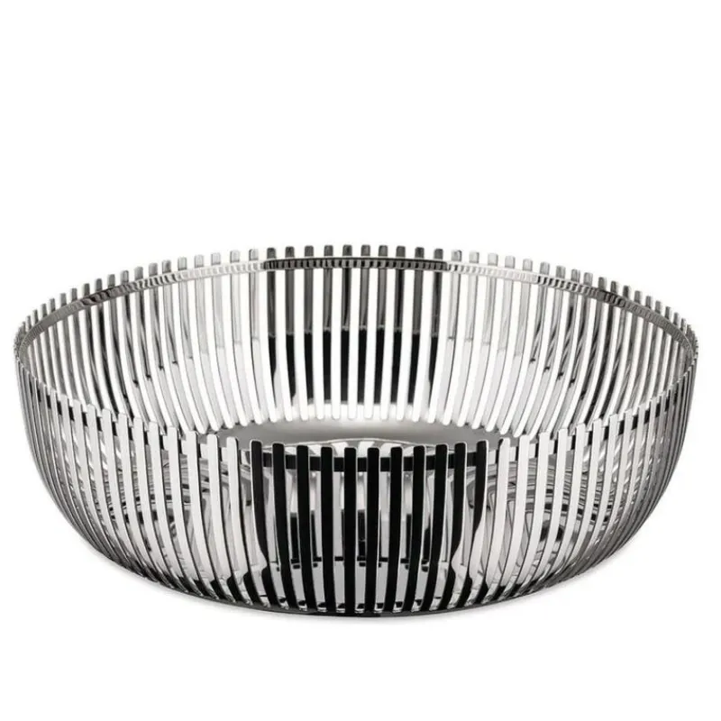 In Anlehnung an die klassischen Galerietabletts des 18. und 19. Jahrhunderts entwarf der Pariser Designer diese Schalenserie für Alessi. Gefertigt aus hochglänzendem Edelstahl beeindrucken die Korbschalen durch zarte Leichtigkeit trotz robuster Fertigung. Achtzig glänzende Stahlstreifen sorgen für ungewohnte Lichtreflexe auf dem glatten Boden der Gefäße. Die Serie PCH02 eignet sich durch ihre flache Form besonders als edler Brotkorb. Ergänzt wird die Linie durch zwei hohe Obstkörbe sowie ein Tablett und eine ovale Schale.