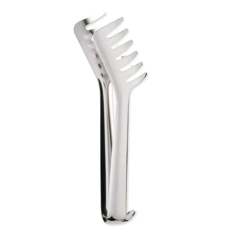 Die Spaghettizange 502 aus Edelstahl von Alessi befördert fertig gekochte Pasta sicher vom Topf auf den Teller. An den krallenartigen Zinken des Zange bleiben Spaghetti und andere Nudelsorten hängen und können so noch etwas abtropfen, bevor sie serviert werden. Mit der praktischen Aufhängeöse lässt sich die Zange nach dem Kochen ganz einfach verstauen. Die Spaghettizange ist 19 cm lang und kann in der Spülmaschine gereinigt werden.