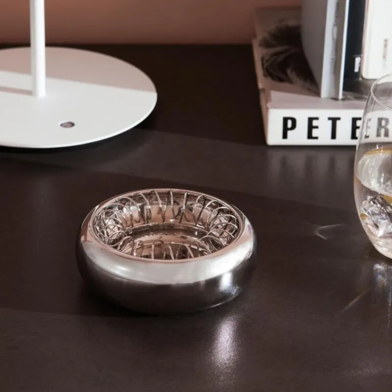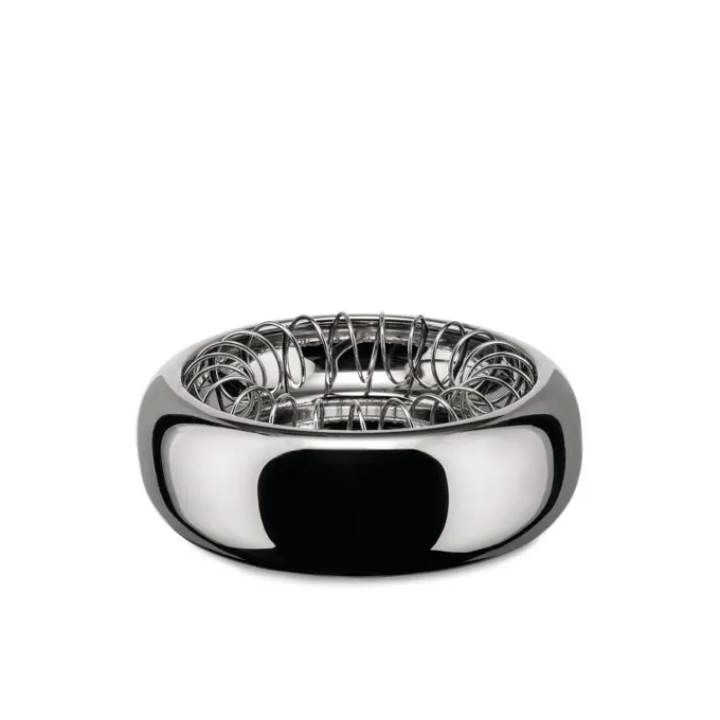 Für den Designer Achille Castiglioni, der diesen Aschenbecher für Alessi entwarf, waren zwei Dinge wichtig: seine Entwürfe sollten praktische Lösungen für die kleinen Probleme des Alltags bereitstellen, und ihre Ästhetik sollte einer breiten Allgemeinheit gefallen. Der schlichte Aschenbecher überzeugt mit durchdachten Details, wie mit der namensgebenden Spirale, die abgelegte Zigaretten festhält. Er besteht komplett aus hochglanzpoliertem Edelstahl und kann deshalb auch in der Spülmaschine gereinigt werden. Der Aschenbecher hat einen Durchmesser von 12 cm und ist 4,5 cm hoch.