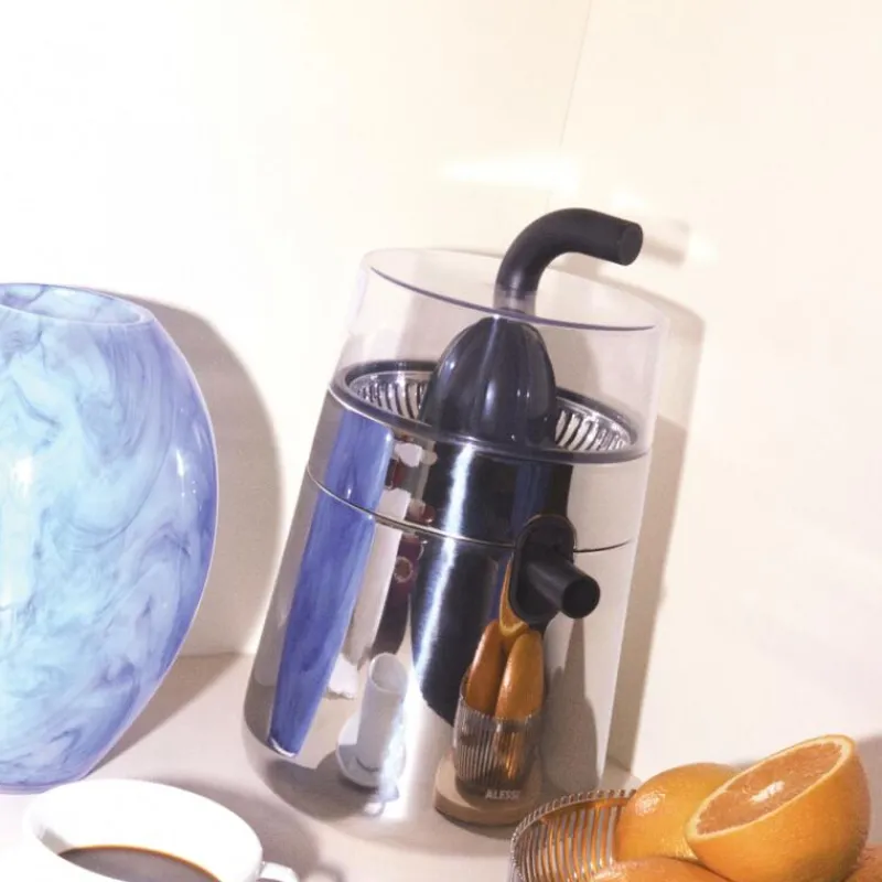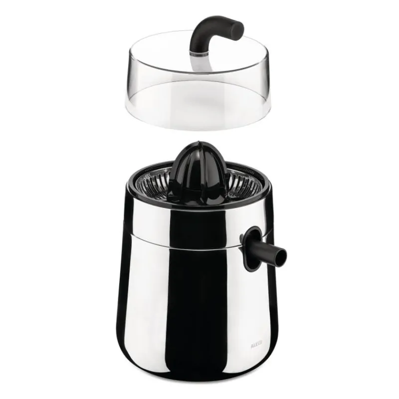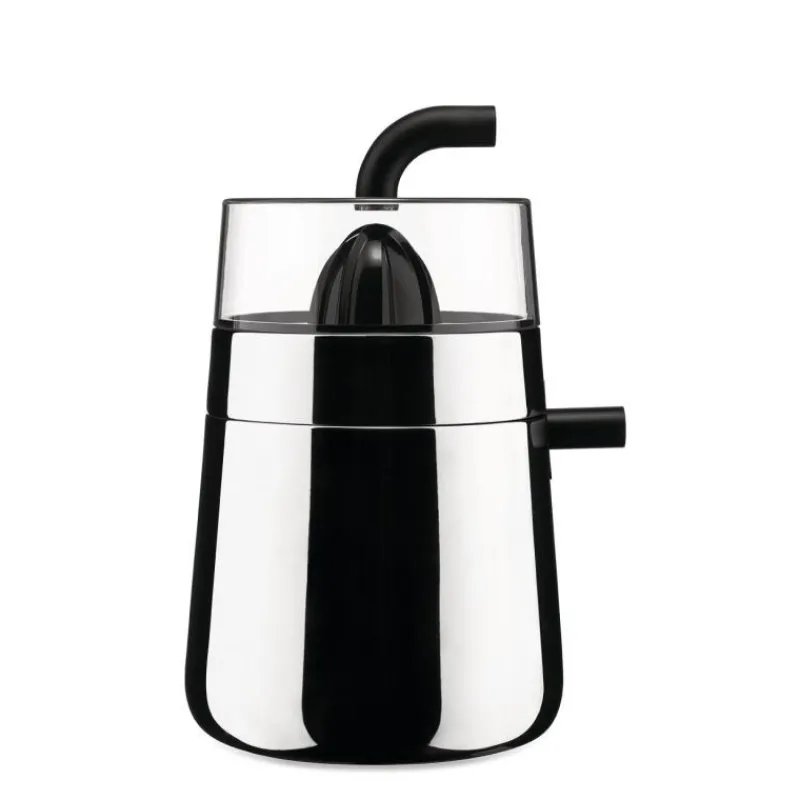 Das japanische Design-Studio Nendo hat in seiner ersten Zusammenarbeit mit Alessi unteren anderem die elektrische Zitronenpresse Toru entworfen. Ihr Gehäuse aus glänzendem Edelstahl ist der Form eines Kruges nachempfunden und spielt auf die Ursprünge der Firma Alessi im Bereich der Metallverarbeitung an. Ihren Namen Toru (jap. für „durch“) bekam die Presse durch den von oben kommenden Griff, der von oben durch den Körper der Zitronenpresse zu gehen scheint und eine durchgehende Linie zum Ausguss bildet. Die Zitronenpresse besteht aus einem Deckel, einem Presskegel, einem Siebeinsatz, einem Behälter mit Ausgießtülle und einem Motorgehäuse, in dessen Basis das aufgewickelte Kabel verschwinden kann. Verschlusskappe, Behälter und Siebeinsatz sind leicht auszubauen und können in der Spülmaschine gereinigt werden. Zusammen mit der rutschfesten Basis, die während der Benutzung für einen sicheren Stand sorgt, ergibt sich so ein stilvolles Designobjekt, der sich perfekt in jede Umgebung einfügt. Die Presse ist 32 cm hoch, 22,5 cm breit und 19,5 cm lang.