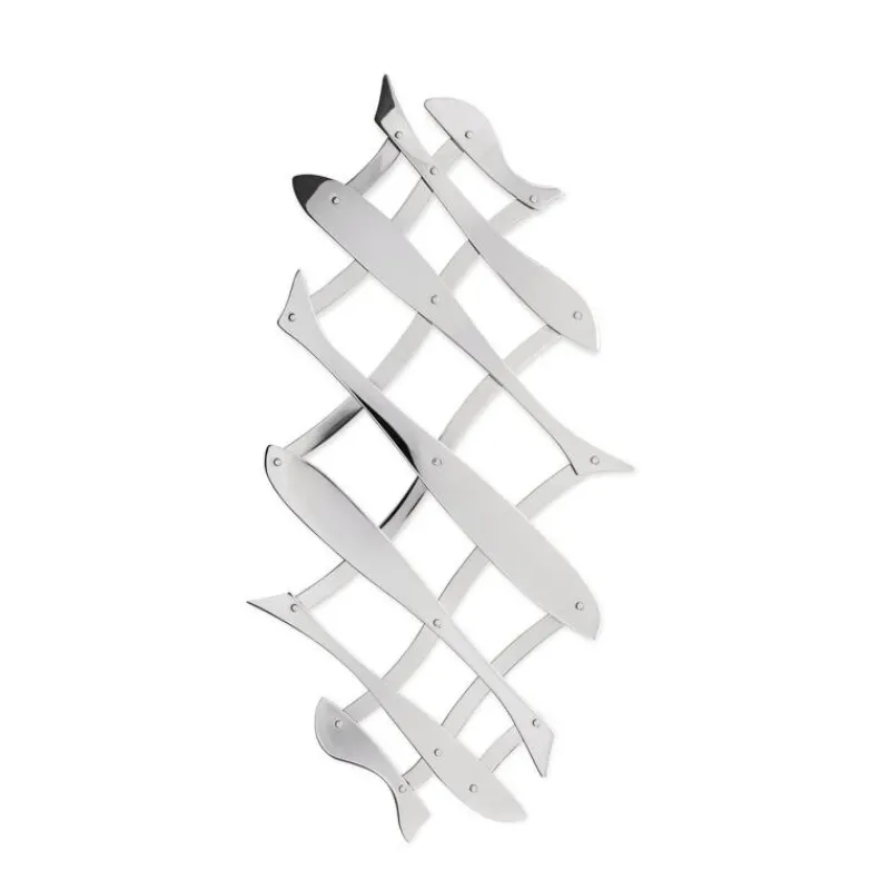 Wie ein Schwarm silbern glänzender Fische wirkt der ausziehbare Topfuntersetzer Pescher von Alessi, der vom italienischen Designduo D’Urbino-Lomazzi entworfen wurde. Zusammengeschoben bietet der Untersetzer Platz für Topf oder Pfanne, auseinandergezogen passt auch eine Auflaufform darauf. Der Topfuntersetzer besteht aus poliertem Edelstahl und ist 51 cm lang.