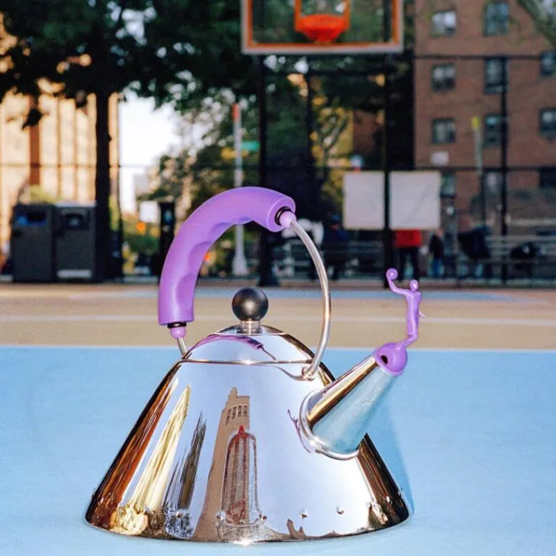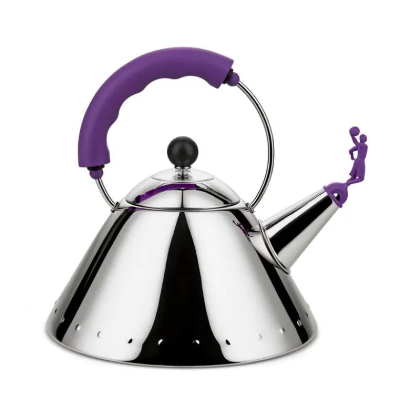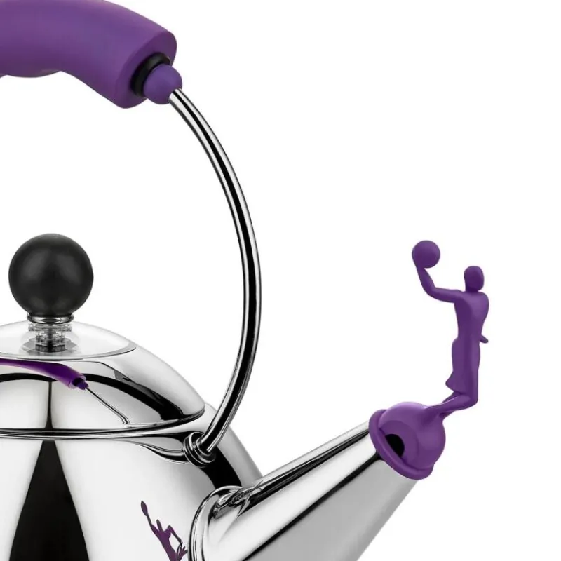 Der ikonische Wasserkessel 9093 gehört zu einer Reihe von Küchenprodukten, die Michael Graves in den 1980er und 90er Jahren für Alessi kreierte und war das erste Produkt eines amerikanischen Designers, das Einzug in das Programm von Alessi hielt. Heute ist der ikonische Wasserkessel das weltweit meist verkaufte Objekt des italienischen Unternehmens Alessi. Dieser Wasserkessel wurde vom Designer Virgil Abloh für eine limitierte ReDesign-Kooperation ausgewählt und neuinterpretiert. Der Stahlkessel selbst verbleibt dabei aber in seiner ursprünglichen schlichten konischen Form, die nur durch einen Punkte-Ring am unteren Rand und einer schwarzen Kugel als Deckelgriff verziert wird. Der Griff aus Polyamid, der vor Hitzabstrahlung schützt, wurde beim Re-Design von Abloh in lila gewählt. In der gleichen Farbe wurde auch der Basketballspieler, der auf einen Korb zufliegt & die Pfeife des Wasserkochers bildet, designt. Das Phänomen Basketball wählte Virgil Abloh nicht zufällig als Motiv – Basketball und seine multikulturelle Symbolik, die ein wesentlicher Bestandteil von Ablohs persönlicher Geschichte ist, treffen auf die Welt des Designs. Das Produkt wird in einer limitierten und nummerierten Auflage von 9999 Stück gefertigt.