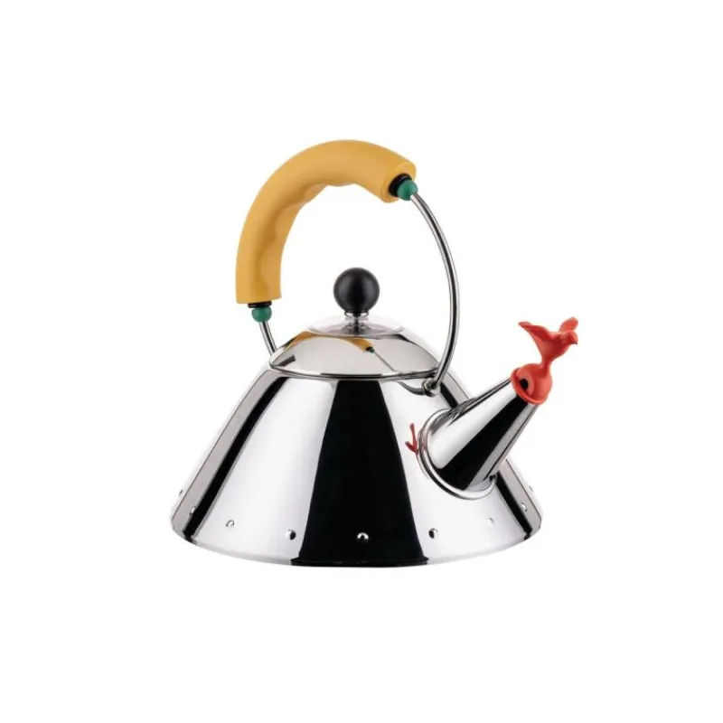 Zu den bekanntesten Entwürfen von Michael Graves gehört der Wasserkessel mit der vogelförmigen Flöte, der über 15 Jahre lang zu den bestverkauftesten Produkten bei Alessi gehörte. Der 1985 designte Edelstahlkessel beeindruckt durch die Verbindung verschiedener Einflüsse wie zum Beispiel Pop Art und Art Deco, die sich zu einer harmonischen Bildsprache verbinden. Durch den Magnetboden aus Edelstahl ist der Kessel auf für den Gebrauch auf Induktionsherden geeignet. Neu wird der Wasserkessel in einer kleineren Variante mit einem Volumen von einem Liter angeboten, deren Farbversion direkt aus der historischen Palette des Designers stammen. Der kleine Wasserkessel ist 20,5 cm hoch und hat einen Durchmesser von 20 cm. Er besteht aus Edelstahl und Polyamid.