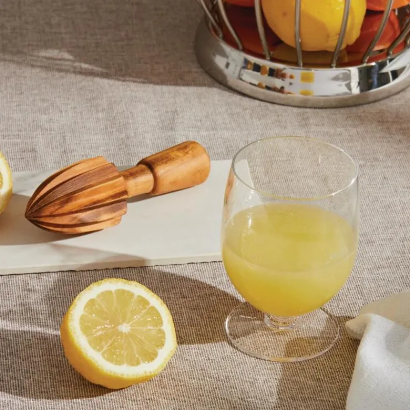 Im Piemont, dem Urspungsort der Firma Alessi, spielt neben der Metallverarbeitung spielt seit jeher auch das Material Holz eine große Rolle. 1988 kaufte Alessi die damals älteste Holzverarbeitungsunternehmen der Region auf, damit diese Verbindung in die Vergangenheit erhalten bleibe. Einige der historischen Entwürfe vom Anfang des 19. Jahrhunderts neu aufgelegt. Das klassische Aussehen dieser Produkte wird durch durch das robuste und hochwertige Material Kirschbaumholt unterstrichen. Die Zitronenpresse aus dieser Serie presst auch noch die kleinste Limette bis zum letzten Tropfen aus. Sie kann dekorativ bei Tisch verwendet werden, um Soßen oder Salate zu verfeinern.br />