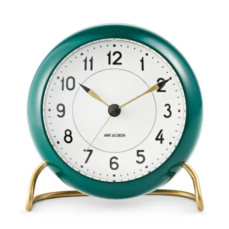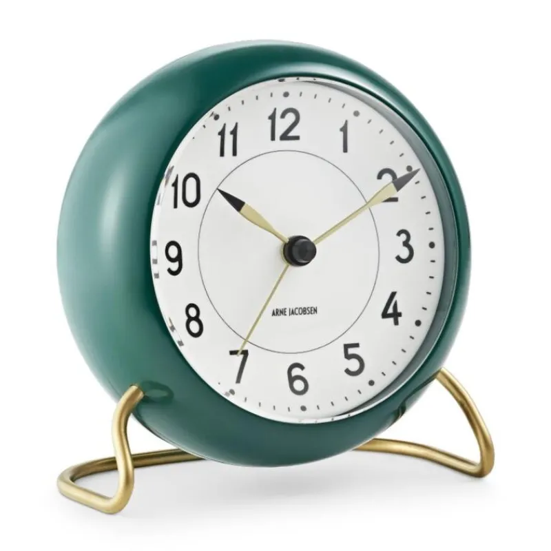 Den Station Wecker entwarf der bekannte dänische Designer Arne Jacobsen bereits in der Mitte der 1930er Jahre. Mit seinen eleganten und geschwungenen Kurven wird er zum attraktiven Designobjekt. Die Tischuhr mit Weckfunktion besteht aus Kunststoff und bruchsicherem Glas, der Fuß ist aus Metall. Für die Zeiteinstellung wird die Rückwand des Weckers abgenommen, indem man sie um ein paar Grad gegen den Uhrzeigersinn dreht. Mit den darunter verborgenen Drehknöpfen lassen sich Uhr- und Weckzeit ganz leicht einstellen. Zusätzlich ist der Wecker mit einem LED-Licht ausgestattet, das durch eine leichte Berührung oben an der Uhr ausgelöst wird und dann fünf Sekunden lang leuchtet. Genauso funktioniert die Snooze-Funktion, die sich bis zu fünf Mal wiederholen lässt. Der Wecker Station hat einen Durchmesser von 11 cm und wird mit zwei AA-Batterien betrieben.
