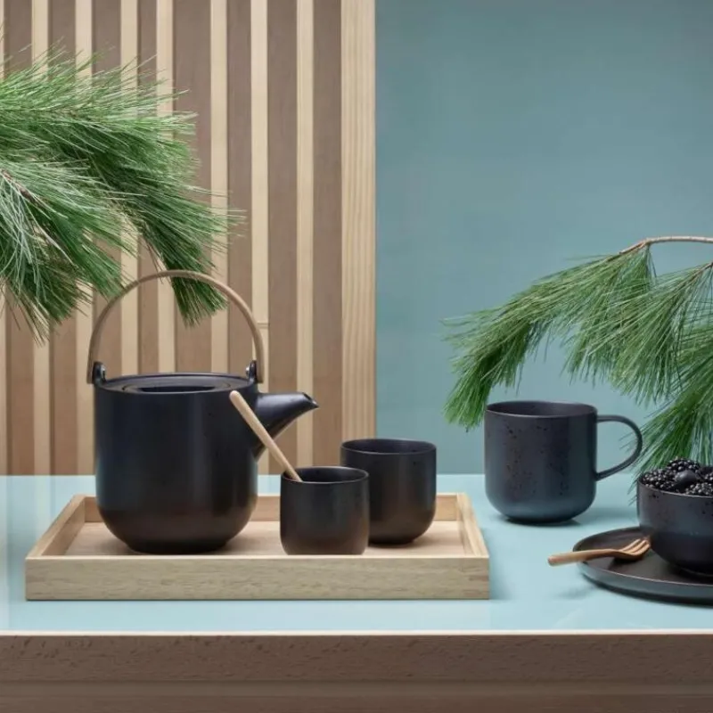 Die Teekanne in der Farbe Kuro besteht aus mattem, schwarz glasiertem Porzellan, das mit einem einzigartigen, glänzenden Sprenkel-Effekt verziert ist. In ihr können sich die Aromen und Farbstoffe des Tees ideal verteilen, ohne sich allzu sehr am Boden abzulagern. Die formschöne Tülle garantiert, dass schon in der ersten Tasse Tee alle leckeren Aromastoffe ankommen. Das Volumen der Teekanne von 1000 ml Tee entspricht dabei etwa fünf Tassen Tee. Aufgrund des Holzhenkels sollte die Kanne nur von Hand gespült werden. Das moderne, puristische Design in Verbindung mit dem robusten Material macht Coppa zum beliebten Allrounder, der perfekt in den Alltag passt, aber auch bei besonderen Anlässen festlich gedeckt werden kann.