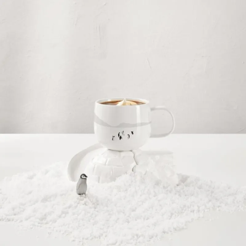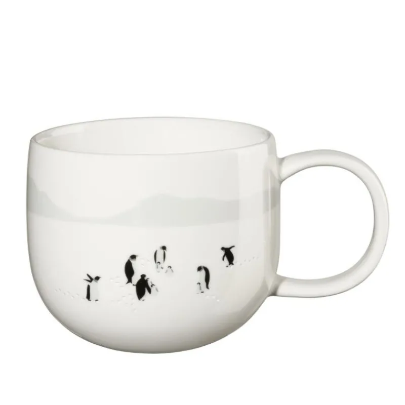 Im Winter erscheint die Natur mit ihren weißen Schneelandschaften, den kahlen Bäumen und dem grauen Himmel fast schwarz-weiß. Die Kollektion Snow Tracks erzählt Geschichten von Mensch und Tier, deren Spuren anhand der sandgestrahlten Gravur fühl- und sichtbar nachzuverfolgen sind. Der Henkelbecher aus Porzellan mit Pinguin-Motiv ist 8,5 cm hoch, er kann in der Spülmaschine gereinigt werden und ist mikrowellen- und gefriergeeignet. Zudem liegt er gut in der Hand und schmeichelt sowohl Links-als auch Rechtshändern. Dem Genuß von heißem Kakao, Tee oder Kaffee steht also nichts mehr im Weg!