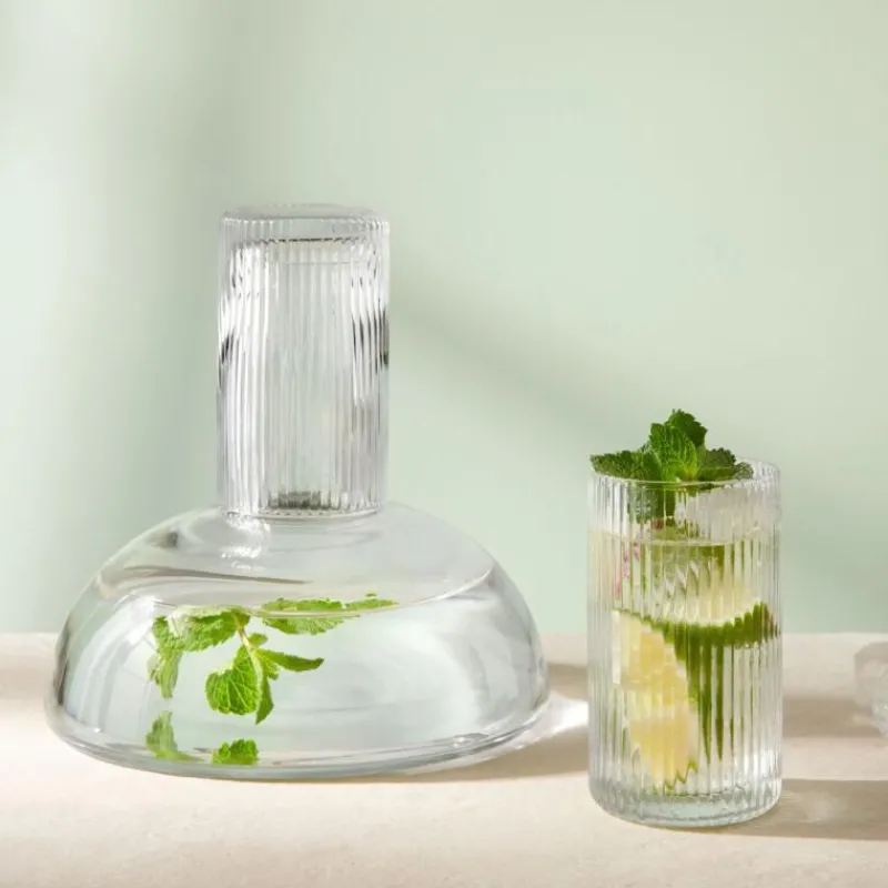Die mundgeblasene Juna-Karaffe setzt sich mit ihrem eindrucksvollen Design und der modernen Riffelung des Trinkglases zeitgemäß und individuell in Szene. Ihre leicht bauchige Form mit dem schlanken Hals liegt gut in der Hand; das Volumen von 1300 ml ist ideal zum Servieren von Wasser, Säften, Limonaden und anderen Kaltgetränken geeignet. Mit ihrem klaren Design, dem transparenten Göas und der modernen Gestaltung ist die Karaffe Juna ein unverzichtbares Glanzstück jeder Hausbar. Sie ist 20,5 cm hoch und hat einen Durchmesser von 20,5 cm. Der zylindrische Deckel lässt sich gleichzeitig als Trinkglas verwenden.
