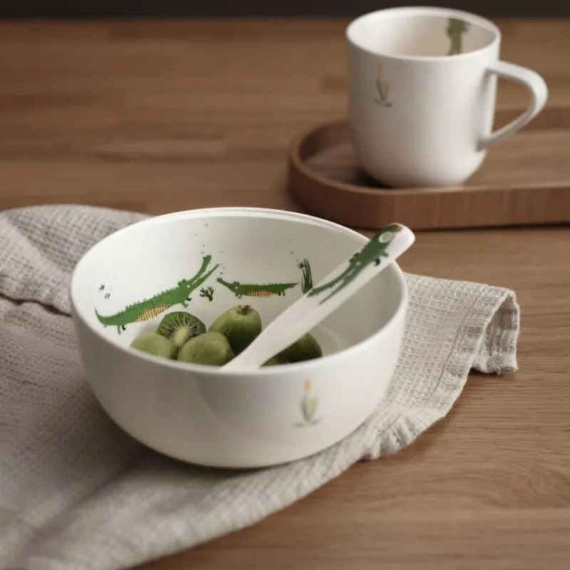 Das fünfteilige Geschirrset Croco Krokodil aus der Serie Kids erzählt eine liebevolle Geschichte und versorgt die Jüngsten mit einem nachhaltigen und geschmacksneutralen Ess-Geschirr. Alle Teile bestehen aus hochwertigem Fine-Bone-China, so lernen Kinder schon im frühen Alter Ess-Kultur sowie den sorgfältigen Umgang mit zerbrechlichen Gegenständen kennen. Fine Bone China ist nicht nur besonders leicht und robust, es ist außerdem ofen-, gefrier- und mikrowellengeeignet und kann problemlos in der Spülmaschine gereinigt werden. Im Lieferumfang enthalten sind ein Teller (Durchmesser 21 cm, Höhe 2 cm), eine Schale (Durchmesser 13,5 cm, H 6,5 cm), ein Henkelbecher (Durchmesser 8 cm, Höhe 8,5 cm) und ein Porzellanlöffel (Länge 13,5 cm, Breite 3,2 cm). Jedes Geschirrset wird mit einem Vorlesebuch geliefert, welches die Geschichte der vier Tiere Emma Elefant, Croco Krokodil, Leo Löwe und Fiona Flamingo erzählt. Das fünfteilige Kindergeschirrset ist das perfekte Geschenk zur Geburt, zur Taufe oder zum Kindergeburtstag.