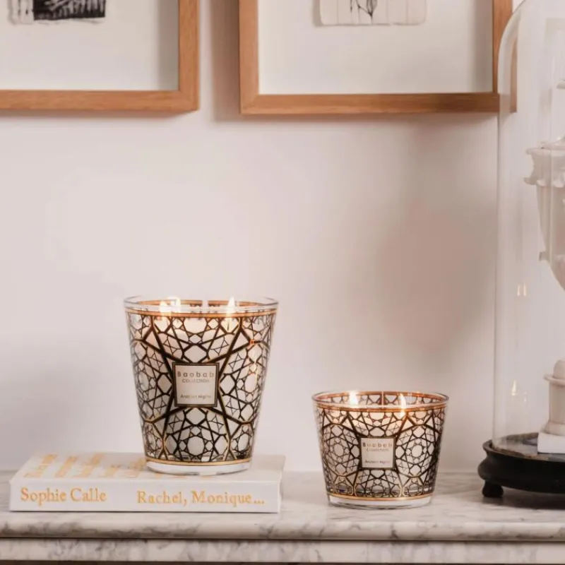 Die Duftkerze Arabian Nights in der Größe Max 10 ist mit einem Siebdruck-Motiv mit Dekor aus 24-karätigem Gold verziert, welches Moucharabieh, also offene Architekturelementen des arabischen Raums darstellt. Die Kopfnote des Duftes Arabian Nights besteht aus Safran, die Basisnote besteht aus Oud und Weihrauch. Die Kerze Max 10 ist 10 cm hoch und hat einen Durchmesser von 12 cm. Bei korrekter Benutzung der Duftkerze hat sie eine Brenndauer von etwa 60 Stunden. Die Verwendung von vier kräftigen Dochten aus ägyptischer Baumwolle sorgt für eine angenehmen und gleichmäßige Raumbeduftung.