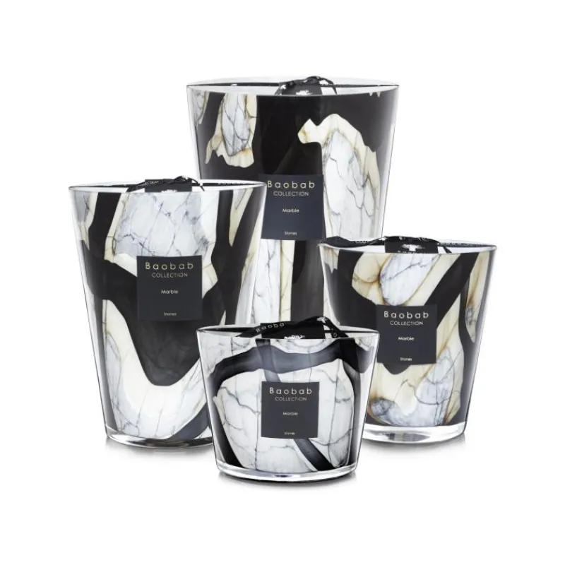 Die Duftkerze Stones Marble in der Größe Max 24 gehört zur limitierten Stones-Edition von Baobab, die von dem seit Jahrtausenden von Menschenhand abgebauten Marmorgestein inspiriert wurde. Das helle Wachs der Kerze befindet sich in einem klaren mundgeblasenem Glas mit einem veschlungenen Muster in Marmor-Optik. Die Kopfnote des Duftes Stones Marble besteht aus ledrigen und beerigen Noten, die von einer Basisnote aus Tuberose abgerundet werden. Die Kerze Max 24 ist 24 cm hoch und hat einen Durchmesser von 19 cm. Bei korrekter Benutzung der Duftkerze hat sie eine Brenndauer von etwa 400 Stunden. Die Verwendung von fünf kräftigenen Dochten aus ägyptischer Baumwolle sorgt für eine angenehmen und gleichmäßige Raumbeduftung.