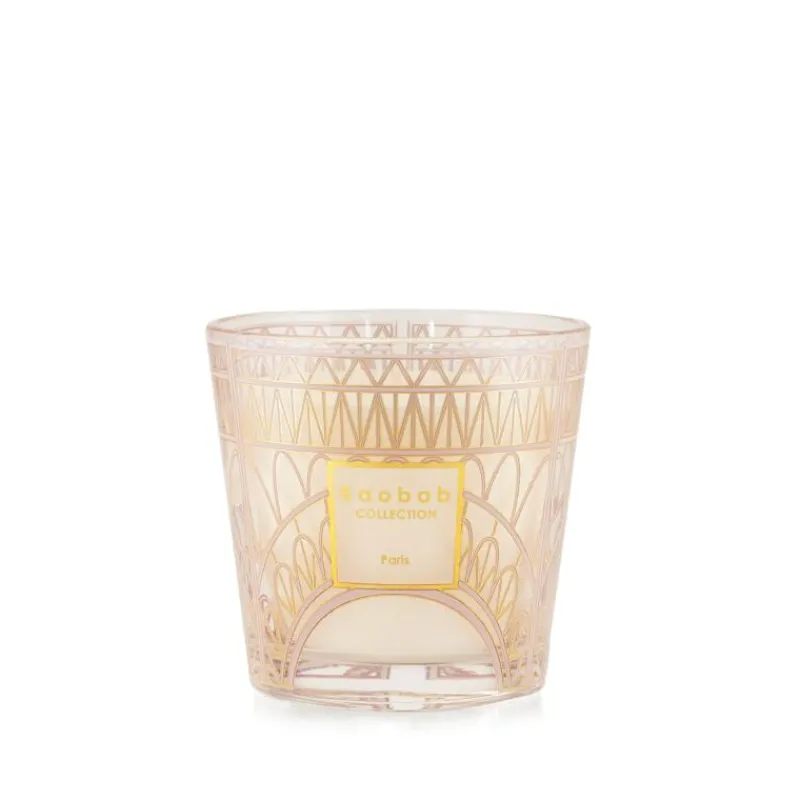 Die Duftkerze Paris in der Größe Max One gehört zur My First Baobab Collection von Baobab und ist mit einem Siebdruck in Zartrosa und Gold verziert, der von der stilisierten Struktur des Eiffelturms inspiriert wurde. Das helle Wachs der Kerze befindet sich in einem rosafarbenen, mundgeblasenem Glas. Die Kopfnote des Duftes Paris besteht aus Linde, die Basisnote besteht aus Tulpe und Kastanienblättern. Die Kerze Max One ist 6,5 cm hoch und hat einen Durchmesser von 9 cm. Bei korrekter Benutzung der Duftkerze hat sie eine Brenndauer von etwa 30 Stunden. Die Verwendung von einem kräftigen Docht aus ägyptischer Baumwolle sorgt für eine angenehmen und gleichmäßige Raumbeduftung.