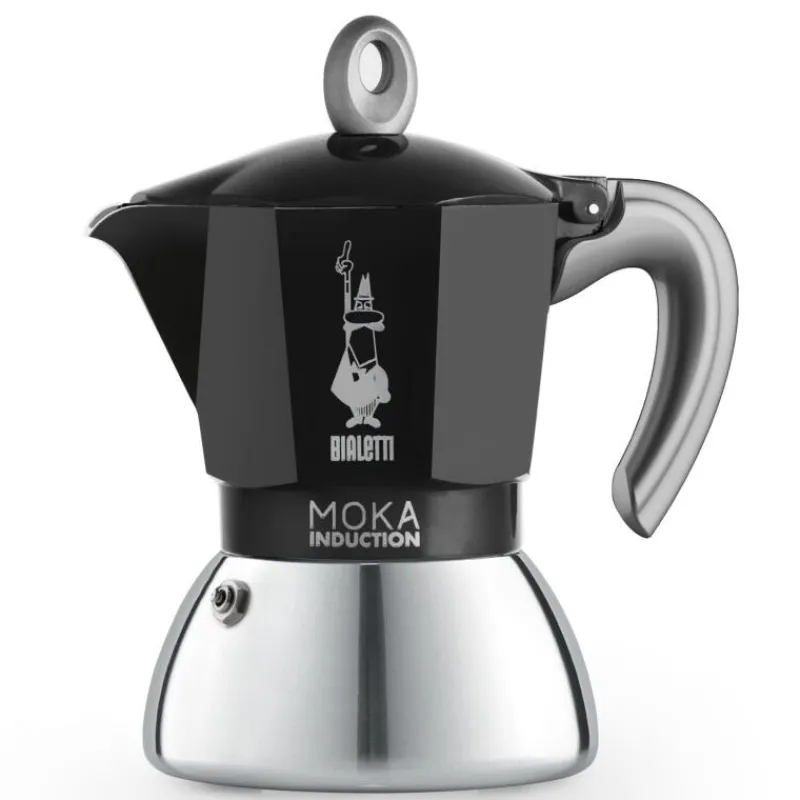 Im Gegensatz zur klassischen Espressokanne Moka Express kommt die Moka Induktion mit ihrem schwarzen Oberteil mit einem Bi-Layer-Kessel daher, einem Wasserkessel aus Zweischichtmaterial. Die äußere Stahlschicht des Kessels garantiert den Betrieb auch auf Induktionsfeldern, während die innere Aluminiumschicht für eine gleichmäßige Wärmeverteilung sorgt. Mit seinem ergonomisch geformten Griff und dem patentierten Sicherheitsventil vereint die Moka Induktion eine einfache Handhabung sowie funktionelles Design zu einem unverzichtbaren Begleiter, der zu jeder Zeit den perfekten Mokka zaubert. Außerdem lässt er sich einfach auseinandernehmen und daher leicht reinigen. In der Variante für 4 Tassen Espresso ist der Espressokocher 16,5 cm hoch und hat einen Durchmesser von 9 cm.