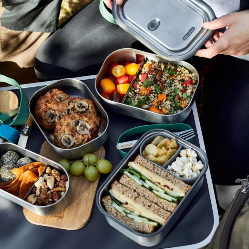 Die kleinere Variante der black+blum Edelstahl-Lunchbox zeichnet sich durch ihre hohe Multifuktionalität aus: sie ist plastikfrei, absolut dicht und kann sowohl als Ofenform als auch als Vorratsdose im Gefrierschrank verwendet werden. Somit können Sie in dieser Lunchbox Ihr Mittagessen transportieren, Gerichte im Ofen zubereiten oder vorgekochte Gerichte in einem Gefrierschrank aufbewahren. Das auf dem Deckel platzierte Silikon-Ventil erzeugt dabei einen sicheren, vakuumdichten Verschluss. Die Gabel, die ebenfalls aus Edelstahl besteht, lässt sich praktisch und sicher mit dem mitgelieferten Silikon-Band befestigen. Die Edelstahlserie ist besonders auf Nachhaltigkeit und Langlebigkeit ausgelegt und stützt das Credo des britischen Herstellers von „Einmal kaufen, gut kaufen“. Das Produkt ist natürlich BPA-frei. Die Lunchbox ist 18 cm lang, 14 cm breit und wiegt 330 Gramm.