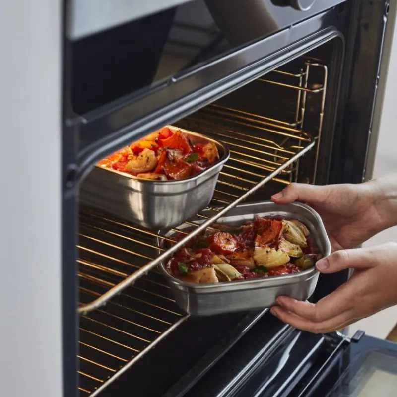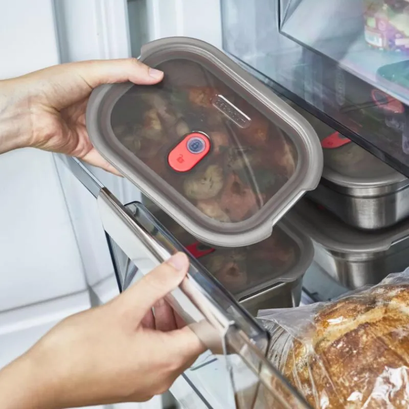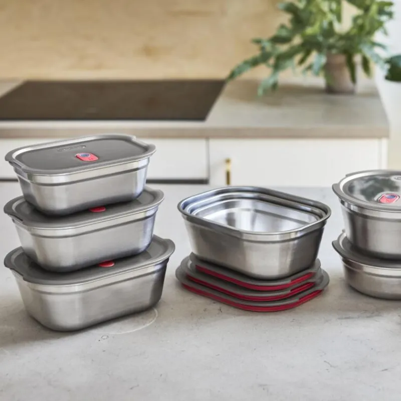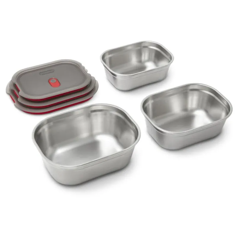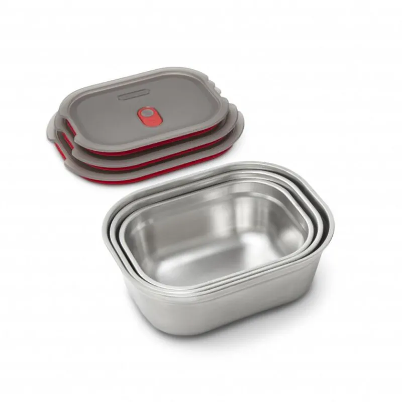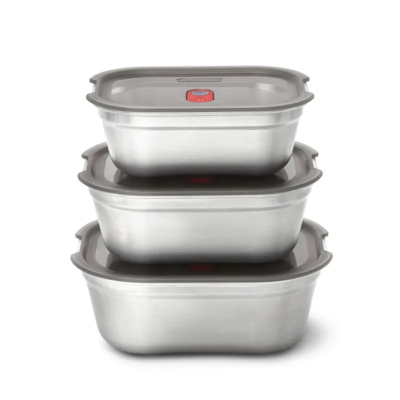 Die erste mikrowellengeeignete 3-in-1-Lunchbox des beliebten britischen Herstellers Black+Blum ist gleichzeitig Lunch-Box und Auflaufform und dient zur Aufbewahrung von Lebensmitteln. Sie wird aus langlebigem Edelstahl und Polypropylen hergestellt und die Vakuumversiegelung sowie die doppelte Silikonlippe sorgen für eine auslaufsichere und luftdichte Aufbewahrung. Die Multifunktionsbox ist sowohl backofen- und gefriergeeignet, als auch spülmaschinengeeignet.Daher eignet sie sich ideal zur Vorbereitung und zur Lagerung von Lebensmitteln, wie etwa zum Meal Prep, also dem Vorkochen und Vorbereiten von Essen für meist mehrere Tage. Da die Vakumversiegelung auch als Dampfventil z.B. in der Mikrowelle dient, kann man die Box zur Mitnahme von Gerichten und dem anschließenden Erwärmen nutzen, ohne das Essen mehrmals umzufüllen. Das Set enthält jeweils eine große, mittlere und kleine Multifunktionsbox.