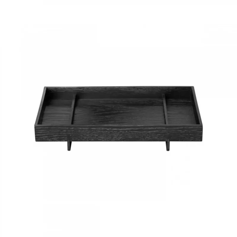 Das geradlinige und funktionale Abento-Tablett, dass von Ad Miller designt wurde, ist von den klassischen Linien der japanischen Holzverarbeitung inspiriert. Seinen Namen hat es von der bekannten asiatischen Bento-Box, die für die Mitnahme von Speisen konzipiert ist und auf verschiedene Bento-Kästchen zur Untergliederung setzt. Die beiden Standfüße, welche ein einfaches Greifen ermöglichen, kreuzen den Korpus des Tabletts und unterteilen die Ablagefläche, wie der Namensgeber der Box, in drei Abschnitte. Neben dem Servieren von Speisen eignet sich das Tablett insbesondere zum Dekorieren. Es ist in 2 Größen erhältlich. In der kleinen Variante ist das Abento-Tablett 30 cm lang und 18 cm breit, es besteht aus schwarzem Hartholz.