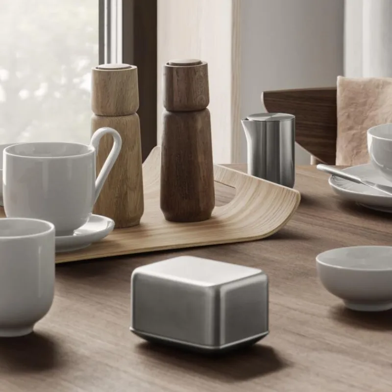 Die Gewürzmühle Ro aus dunkel geöltem Eichenholz besticht durch die einzigartige Maserung des Holzes und das schlichte Design.Sie ist sowohl für das Mahlen von Salz als auch Pfeffer geeignet, da sie mit einem Keramikmahlwerk ausgestattet ist. Ihr minimalistisches, vom der japanischen Teezeremonie inspiriertes Design ist eine formschöne Fusion asiatischer Ästhetik und nordischem Designs, das von der Designerin Theresa Rand entworfen wurde. Passenderweise bedeutet das japanische Wort Ro auf deutsch Gelassenheit. Die Ro Salz- und Pfeffermühle ist 16 cm hoch und hat einen Durchmesser von 5,5 cm. Sie kann zur Reinigung mit einem feuchten Tuch abgewischt werden.