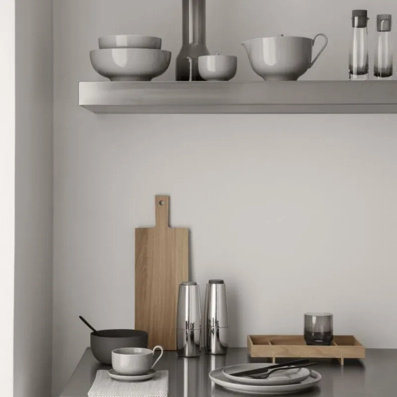 Die beiden Gewürzmühlen Salpi von Blomus setzen mit ihren Einstellrädchen in unterschiedlichen Grautönen elegante Akzente auf dem Esstisch. Sie lassen sich mit einem funktionellen Steckmechanismus öffnen und befüllen. Dabei kann der Mahlgrad des Keramikmahlwerks von sehr fein bis grob eingestellt werden. Die glänzend polierte Oberfläche der sanft gerundeten Mühlen reflektiert das Licht, der schmale Körper der Mühlen liegt beim Mahlen angenehm in der Hand. Die Salpi Salz- & Pfeffermühle ist jeweils 20 cm hoch und hat einen Durchmesser von 7 cm. Die Mühlen können zur Reinigung mit einem feuchten Tuch abgewischt werden.