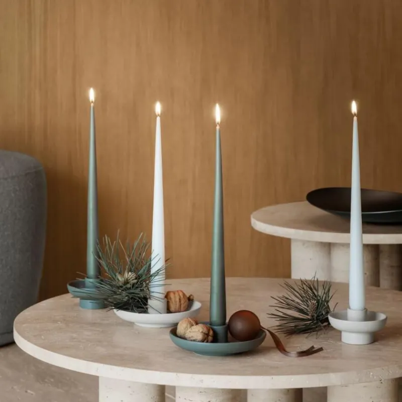 Der von Frederike Martens entworfene Kerzenhalter Vela ist ein echtes Allround-Basic. In dem aus Keramik gefertigten Halter findet eine handsübliche Tafelkerze mit einem Durchmesser von 2,2 cm sicheren Halt, außerdem lässt sich das Innere der Schale auf immer wieder neue Weise dekorieren. Die matte Oberfläche passt nicht nur zu Tannenzweigen, Nüssen und Kugeln, auch Süßigkeiten oder Plätzchen finden in der Schale aus Steingut mit einem Durchmesser von 14 cm Platz.