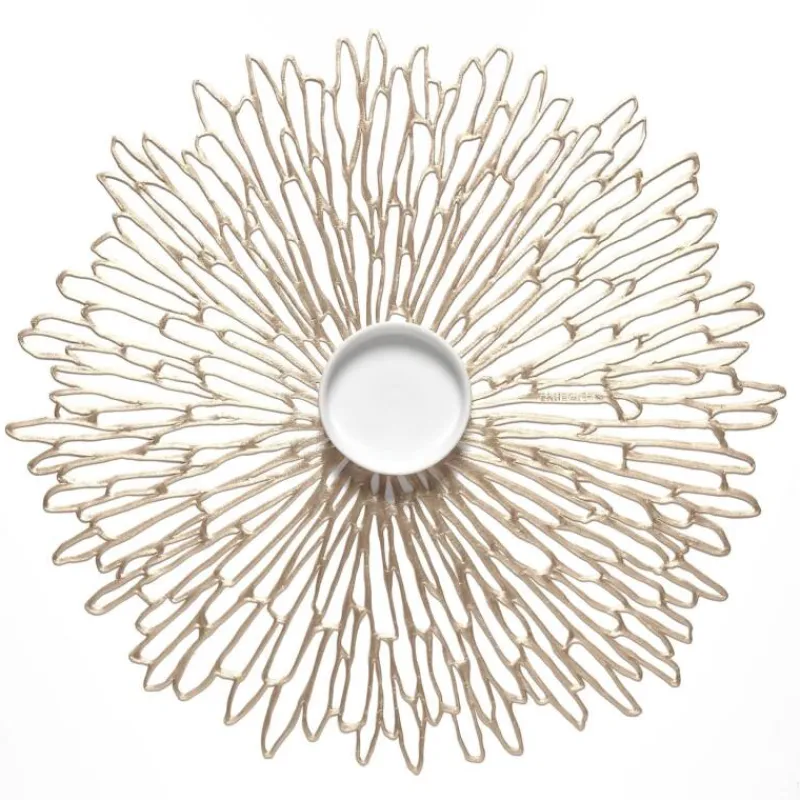 Das Tischset Bloom in der Farbe Champagne erweitert durch die innovative Formtechnik das große Sortiment von Chilewich. Mit seinem durchbrochenen Muster wirkt es eher wie ein Platzteller als ein Tischset, die goldglänzenden Blütenblätter der Chrysantheme umranden den Teller auf eine dekorative Weise. Mit seiner runden Form passt das Set ideal auf runde oder ovale Tische, macht sich aber auch auf eckigen Ess- und Gartentisch eine gute Figur. Zudem ist es sehr pflegeleicht – einfach mit einem feuchten Tuch abwischen und lufttrocknen lassen. Das Tischset Pressed Vinyl Bloom Round Champagne hat einen Durchmesser von 38 cm.