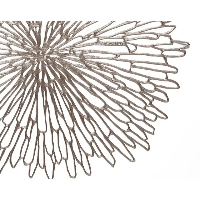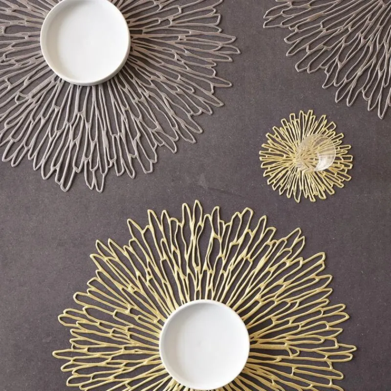 Das Tischset Bloom in der Farbe Gunmetal erweitert durch die innovative Formtechnik das große Sortiment von Chilewich. Mit seinem durchbrochenen Muster wirkt es eher wie ein Platzteller als ein Tischset, die braunglänzenden Blütenblätter der Chrysantheme umranden den Teller auf eine dekorative Weise. Mit seiner runden Form passt das Set ideal auf runde oder ovale Tische, macht sich aber auch auf eckigen Ess- und Gartentisch eine gute Figur. Zudem ist es sehr pflegeleicht – einfach mit einem feuchten Tuch abwischen und lufttrocknen lassen. Das Tischset Pressed Vinyl Bloom Round Gunmetal hat einen Durchmesser von 38 cm.
