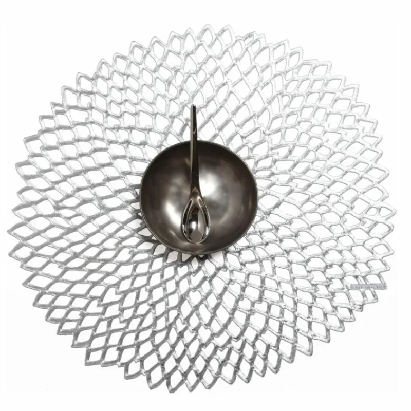Das Tischset Dahlia in der Farbe Silber erweitert durch die innovative Formtechnik das große Sortiment von Chilewich. Mit seinem durchbrochenen Muster wirkt es eher wie ein Platzteller als ein Tischset, die silbrig glänzenden Blütenspitzen umranden den Teller auf eine dekorative Weise. Mit seiner runden Form passt das Set ideal auf runde oder ovale Tische, macht sich aber auch auf eckigen Ess- und Gartentisch eine gute Figur. Zudem ist es sehr pflegeleicht – einfach mit einem feuchten Tuch abwischen und lufttrocknen lassen. Das Tischset Pressed Vinyl Dahlia Round Silver hat einen Durchmesser von 38 cm.