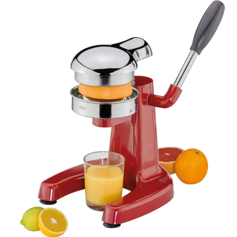 Frischen Saft im Handumdrehen liefert die professionelle Saftpresse Positano aus schwerem Metall von Cilio. Vier Saugfüße sorgen für einen sicheren Stand, wenn mit dem Griff mit Hebelwirkung ohne großen Kraftauswand der frische Saft aus Orangen, Zitronen, Limetten und anderen Früchten gepresst wird. Der Trichter sowie der Presskegel lassen sich nach Gebrauch leicht entnehmen und können in der Spülmaschine gereinigt werden. Durch den Trichter läuft die wertvolle Flüssigkeit direkt in ein untergestelltes Glas, so wird ein umständliches Umfüllen vermieden. Die handliche Saftpresse Positano ist 23 cm hoch, 23 cm lang und 25 cm breit.
