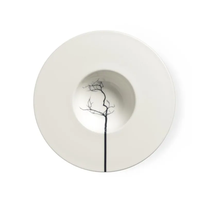 Alle Teile der Black Forest-Kollektion von Dibbern sind mit unterschiedlichen, schwarzen Baumsilhouetten verziert, die gleichzeitig natürlich und abstrakt wirken. Das grafische Element des Baumes ist von der Natur inspiriert und wird auf den Teller und Tassen modern und individuell inszeniert. Das Dekor wird dabei auf den Teilen der Serie Pure aufgetragen, sodass Black Forest mit dieser schlicht weißen Serien wundervoll kombinierbar ist. Die Eignung für die Mikrowelle und Spülmaschine trägt dazu bei, die Serie Black Forest zum lebenslangen Begleiter zu machen. Der tiefe Teller mit breitem Rand und mit einem Durchmesser von 26 cm und einem Fassungsvermögen von 250 ml ist ist ein besonderes Gedeck für Gourmet-Experten und Feinschmecker. Hier steht der Geschmack der Speisen und deren Präsentation im Vordergrund, deshalb ist der Teller mit einem besonders breiten Rand ausgestattet, der Spielraum für ausgefallene Garnierungen bietet.