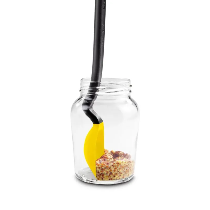 Der Silikonlöffel Mini Supoon hat zwei wichtige Funktionen: er lässt sich als Servierlöffel nutzen und schabt Gläser, Dosen und andere Behälter sauber aus. Der Spitze des Küchenlöffels besteht aus weichem Silikon und ist biegsam, so erreicht Supoon jede Ecke und Kante und hinterlässt sie sauber. Der Griff des Löffel ist gebogen, sodass der benutzte Löffel nicht die Arbeitsplatte berührt und sie so sauberhält. Mini Supoon ist hitzebeständig bis zu 260°C, kann also auch zum Servieren von Tapas oder Dips genutzt werden. Der Küchenlöffel besteht aus Nylon und Silikon, ist spülmaschinengeeignet und 20,2 cm lang.