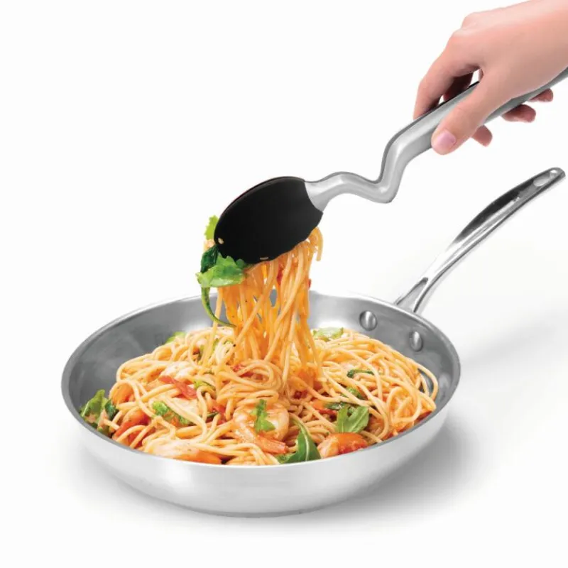 Clongs ist eine Küchenzange, die sich mit nur einem Knopfdruck öffnet und schließt. Der Mechanismus funktioniert wie der eines Kugelschreibers: mit nur einer Hand lässt sich die Zange so einfach bedienen. Zusätzlich ist sie mit einem gebogenen Stiel ausgestattet, mit dem sie auf der Küchenanrichte oder dem Pfannenrand aufgesetzt werden kann. So bleibt die Zange immer sauber und verschmutzt keine Oberflächen. Der gewellte Rand des Zangenkopfes ist ideal zum Servieren von Lebensmitteln geeignet, die stumpfe Spitze ermöglicht ein leichtes Aufnehmen auch von kleinen Speisen. Die Spitze besteht zudem aus weichem Silikon, so zerkratzt sie weder Pfannen noch Töpfe. Clongs ist hitzebeständig bis 260°Celsius , kann in der Spülmaschine gereinigt werden und ist 31,5 cm lang.