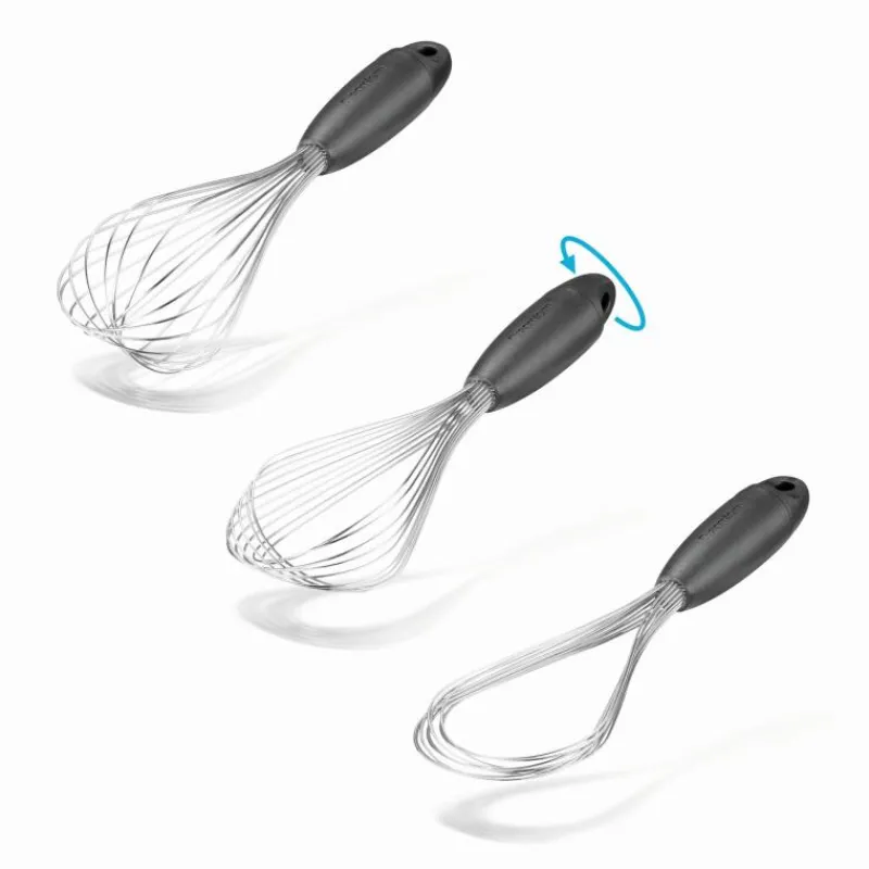 Der Schneebesen Flisk lässt sich mit einem Handgriff in drei verschiedene Formen bringen: als runder Schneebesen schlägt er Sahne auf, vermischt Flüssigkeiten und schlägt sie zu fluffigen Cremes auf, mit einer halben Drehung des ergonomisch geformten Griffes wird er flacher und verrührt so Saucen und geringe Mengen an Flüssigkeiten. Ganz flach ist er perfekt zum Ablöschen von Bratensatz geeignet. Auch zum Abstreichen und Reinigen ist diese flache Art ideal. Nach der Reinigung in der Spülmaschine lässt sich Flisk so auch platzsparend verstauen. Der Schneebesen besteht aus Edelstahl und Polypropylen und ist 29,5 cm lang.