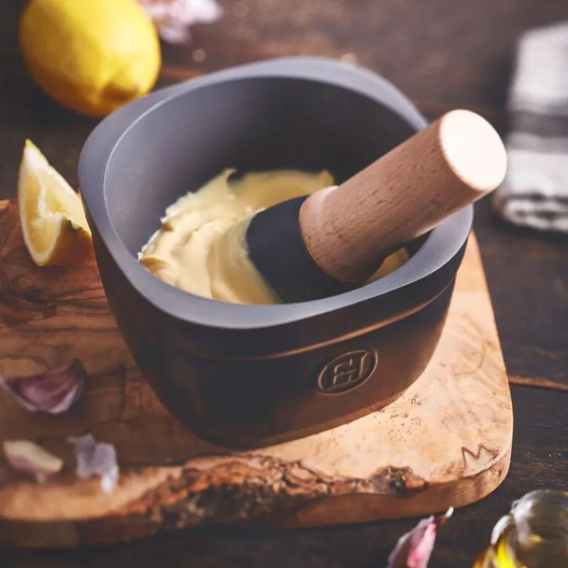 Der Mörser ist eines der ältesten Küchengeräte überhaupt, denn durch das Zerreiben und Zermahlen von unterschiedlichsten Zutaten lassen sich verschiedenste Aromen miteinander kombinieren. Die glasierte Oberfläche im inneren Bereich des Mörsers verhindert durch ihre Struktur, dass die entsprechenden Zutaten wegrutschen und lässt sich zudem noch leichter reinigen, sodass keine Rückstände verbleiben. Durch das großzügige Volumen eignet sich der Mörser speziell für Pesto-Saucen, Guacamole, Currypasten und andere unterschiedlichste Zubereitungen.Auch hier vereint die Keramik des renommierten Herstellers Funktionalität und Ästhetik. So ist sie besonders resistent gegenüber Stößen und Temperaturwechseln. Das durch ein spezielles Produktionsverfahren hergestellte besonders harte Email, das Emile Henry verwendet, bekommt darüber hinaus keine Haarrisse und ist sehr widerstandsfähig. So kann etwa auf der Keramik direkt geschnitten werden und sie kann in der Spülmaschine gereinigt werden, ohne das die Farbe verblasst. Der Stößel sollte mit einem Schwamm gereinigt werden. Der Mörser ist 9,5 cm hoch und hat ein Durchmesser von 16 cm. Das Volumen beträgt 900 ml.
