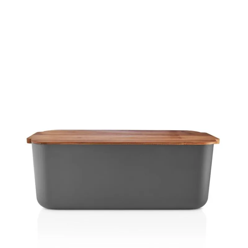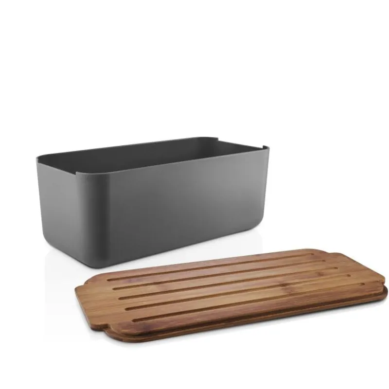 Für die optimale Aufbewahrung von frischem Brot eignet sich der Brotkasten aus grauem Kunststoff von Eva Solo bestens. Der Deckel aus geöltem, karbonisiertem Bambusholz kann auch als Schneidebrett genutzt werden, in den länglichen Rillen sammeln sich Krümel und können einfach entsorgt werden, ohne die Küchenarbeitsplatte oder den Esstisch zu beschmutzen. Der Brotkasten kann in der Spülmaschine gereinigt werden, der Deckel sollte nur von Hand gespült und von Zeit zu Zeit eingeölt werden. Der Brotkasten ist 42 cm lang, 19 cm breit und 16 cm hoch.