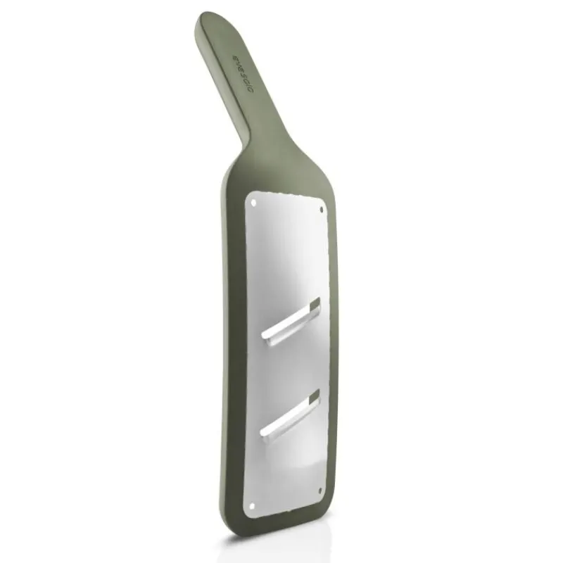 Die neue Green Tools Serie von Eva Solo greift einen aktuellen Trend zu mehr Nachhaltigkeit und Umweltfreundlichkeit. Das verwendete Verbundmaterial ersetzt dabei die Hälfte des sonst verwendeten Kunststoffs durch eine allergiegetestete Weizenfaser (getestet von Intertek). So wird Plastik eingespart und es entstehen schlichte, aber durchdachte und umweltfreundliche Produkte für die Küche. Ein Teil der Green Tools Serie ist der Küchenhobel, der leckere Zutaten für allerlei Gerichte in feine Scheiben schneidet. Sein rutschfester Gummifuß sorgt für einen sicheren Stand, mit seinem Reibblatt ist er ideal geeignet, um dünne Scheiben aus Gemüse, Käse, Schokolade oder Trüffeln herzustellen. Die Reibe kann in der Spülmaschine gereinigt werden, allerdings wird das Spülen von Hand empfohlen, da sie auf Dauer sonst stumpf wird. Die Hobel-Küchenreibe ist 26,4 cm lang.
