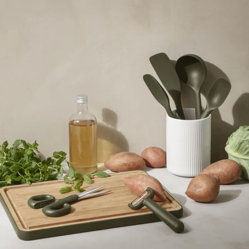 Die neue Green Tools Serie von Eva Solo greift einen aktuellen Trend zu mehr Nachhaltigkeit und Umweltfreundlichkeit. Das verwendete Verbundmaterial ersetzt dabei die Hälfte des sonst verwendeten Kunststoffs durch eine allergiegetestete Weizenfaser (getestet von Intertek). So wird Plastik eingespart und es entstehen schlichte, aber durchdachte und umweltfreundliche Produkte für die Küche. Ein Teil der Green Tools Serie ist der praktische Pfannenheber, mit dem die Speisenzubereitung zum Kinderspiel wird, denn die Speisen lösen sich leicht. Dank seines abgerundeten Griffs liegt der Heber gut in der Hand, er lässt sich in der Spülmaschine reinigen und ist 31 cm lang.