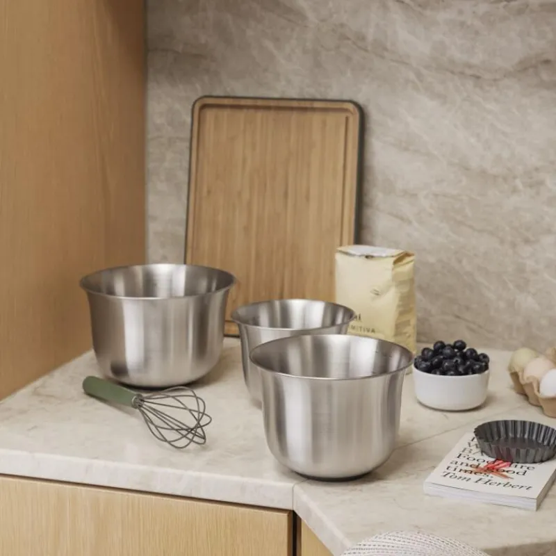 Die Green Tools Serie von Eva Solo greift einen aktuellen Trend zu mehr Nachhaltigkeit und Umweltfreundlichkeit. Die Serie besteht aus funktionellen Küchenutensilien, bei denen auf nachhaltiges bzw. recyceltes Material und klare Linien Wert gelegt wurde. Ein Teil der Green Tools Serie sind die Rührschüsseln mit einem Fassungsvermögen von 1,5, 2,3 bzw. 3,3 Litern. Sie lassen sich ideal zum Mischen, Kneten und Aufbewahren von Lebensmitteln verwenden und können problemlos mit Schneebesen oder Handmixern aus Metall verwendet werden. Die Schüsseln bestehen zu 90% aus recyceltem Edelstahl, daher sind sie sher robust und langlebig. Ein Gummiring an der Unterseite sorgt für einen sicheren Stand während der Verwendung. Eine Skalenmarkierung an der Innenseite erleichtert das Abmessen von Zutaten, zudem sind die Rührschüsseln spülmaschinengeeignet. Im Set enthalten sind drei ineinander stapelbare Rührschüsseln.