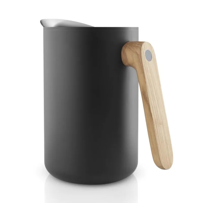 Die Isolierkanne aus schwarzem Kunststoff passt in Form und Ausdruck perfekt zur restlichen Nordic Kitchen-Serie von Eva Solo. Dank des Vakuum-Edelstahl-Einsatzes bleiben Kaffee und Tee in der sehr robusten und schlagfesten Kanne lange heiß. Der attraktive Eichenholzgriff liegt mit seinen abgerundeten Kanten beim Servieren gut in der Hand. Der Gießrand aus Edelstahl ist zu 100 % tropffrei. Die Kanne lässt sich ganz einfach mit einem weichem Lappen und etwas Spülmittel reinigen.